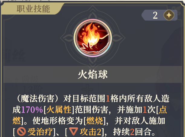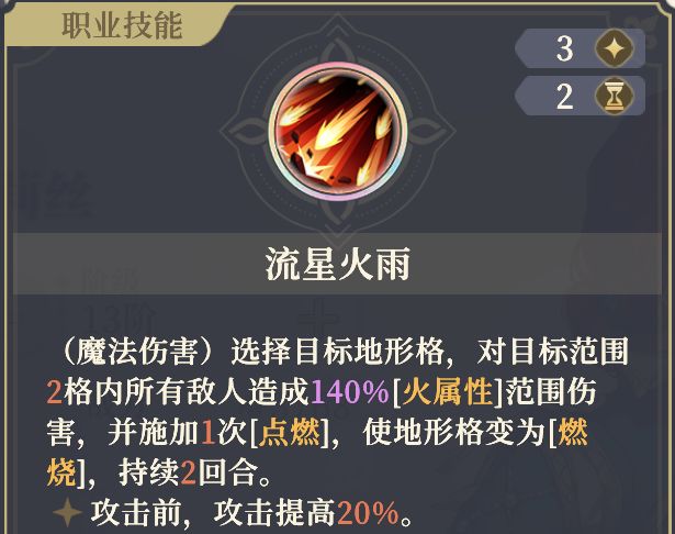 第二个输出技,是三阶右的火属性技能,流星火雨。140%倍率,不算高。可以额外始加1次点燃,并创造火地型,范围略小,只有2格。