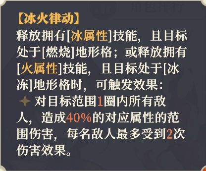3星后的特莉丝就能活动质变,解锁重要功能:在触发冰火律动时,可回能1豆,并且技能冷却减少1回合。这个功能是特莉丝能够技能自循环的保证。而冰火律动的触发条件,需要敌人处于冰地形时,特莉丝用火属性技能攻击,就能触发冰火律动,敌人会受到额外的40%倍率的伤害;反过来也一样,敌人在火地形上,则用冰属性技能触发。