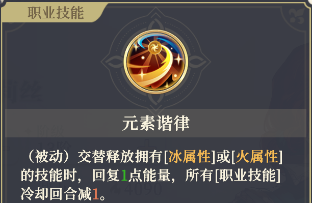 第四个,则是特莉丝的11阶右被动,元素协律。这个技能主要用来帮特莉丝减cd,只要交替使用冰火技能就能减少技能冷却1回合,条件宽松。