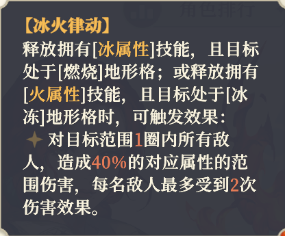 在不能站桩的关卡,比如关卡交大,敌人无法触发冰火律动的是时候,则需要用11阶右的被动元素协律。值得注意的是:特殊普攻也可以触发冰火律动。