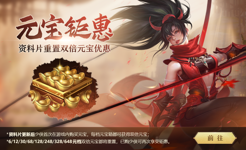 活动内容:喜迎炽霄问道版本上线,元宝箱购买福利将进行重置。少侠前往【奇珍阁】点击右上角【元宝获取】购买元宝箱,即可领取双倍元宝福利。重置前未购买元宝箱的少侠,福利次数不会累计保留。