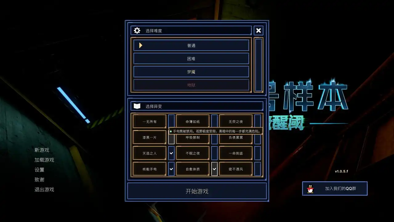 本作整体而言还是存在一定的生存压力的,如果想让自己过得好一些,可以选择普通难度。同时开局还有自定义“异变”机制,不过你看看这里面都是些啥让人血压升高的玩意啊?命薄如纸--初始生命值为1,一碰就毙命;呼吸禁制:佩戴能保你命的防毒面具时,各种行为大幅受限;漆黑一片:这就更屌了,直接把你手电筒给禁用了...只能说大部分都太遭罪了太遭罪了,我看来看去就只有核能手电筒和自愈体质像是正面Buff(天选之人不清楚是干嘛的),果断选了吧。