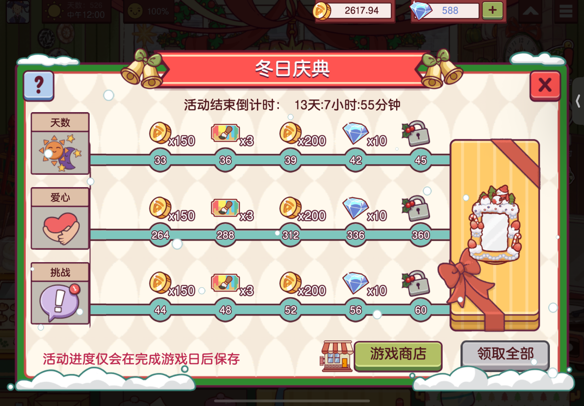 1.如果完全不花钻石的话大概五天(全勤情况下)拿到壁纸,八天拿到冰屋(花园装饰)