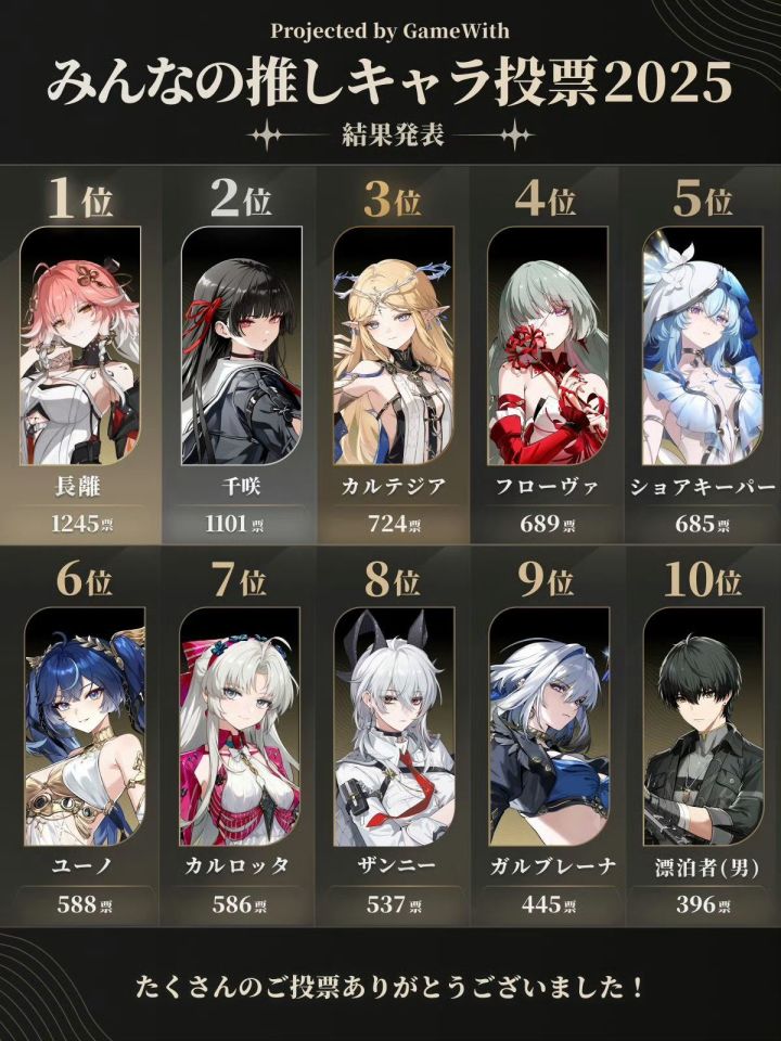 没想到日本玩家那边清一色的女角色排名靠前啊,看来日服大概是男玩家为主,另外唯一进前十的男角色就是男漂,在国服应该也是男漂人气最高了,这点和其他手游还是有蛮大不同的,一般这种主角其实挺难进入角色人气榜的,毕竟这是玩家的化身嘛。
