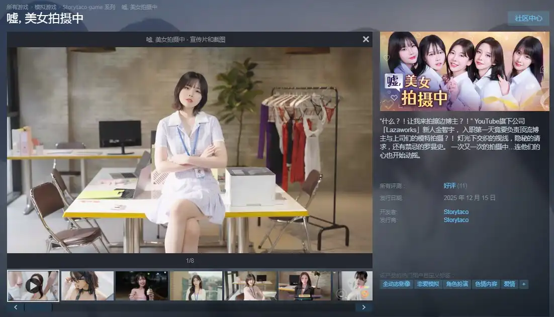 《嘘, 美女拍摄中》是著名的韩系影游《阿西, 美女室友竟然...?》出品方Storytaco全新推出福利系新游。 玩家将扮演YouTube旗下公司「Lazaworks」的新人金智宇。然而 入职第一天竟然就要要负责顶流博主与上司们的模特拍摄?!(还有这种好事?) 而在灯光下交织的视线中,各种隐秘的请求随之而来。甚至还有禁忌的罗曼史。这谁顶得住啊?