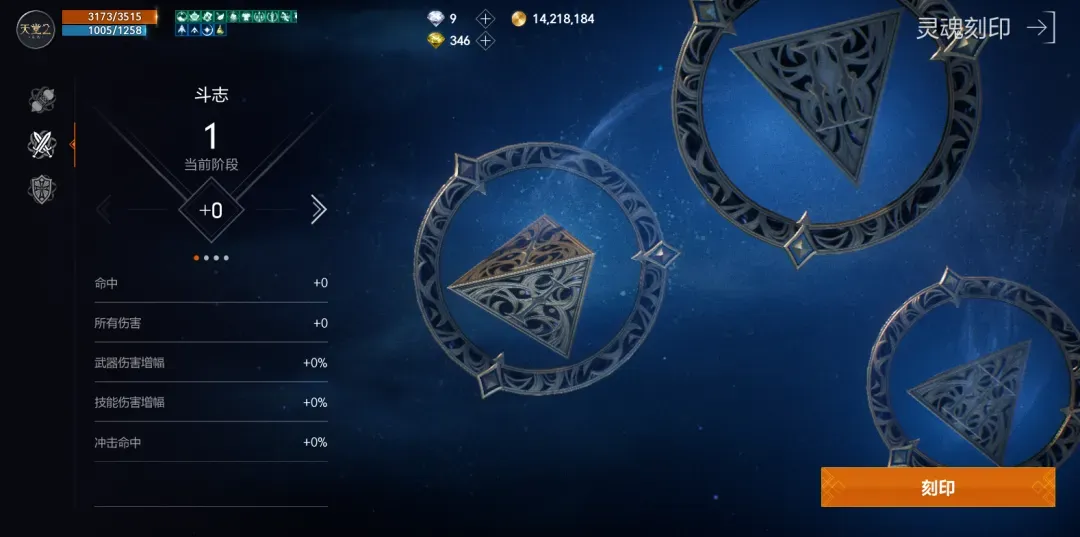 斗志模块提升的是武器输出相关内容,前期大家刷怪打BOSS居多,可以优先刻印“斗志”。“斗志”刻印后可提升“命中”“所有伤害”“武器伤害增幅”“技能伤害增幅”以及“冲击命中”这些属性。