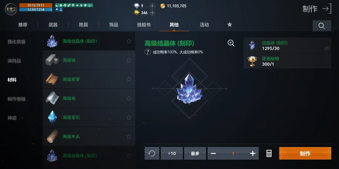 除此之外,高级结晶体还可以通过2种制作方式获得!一种是【结晶体+恩宠秘物】,另一种是【金币+结晶体+生命之石】。