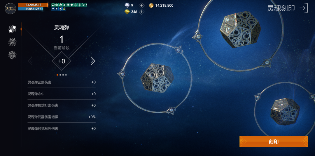 在游戏前期,灵魂弹的数量相对有限,因此灵魂弹的刻印可以先不点,或者点1级确保部分属性增益!可以等后续等战斗更频繁,或者挑战难度BOSS时,再刻印更多的灵魂弹模块~