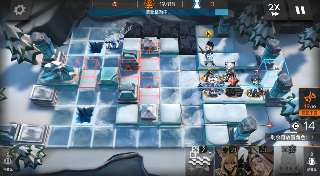 第6关开局先锋在古米那边,然后换成近卫重装之类的,先锋扛不住。叠层的狙击术士和辅助朝上当输出度过前面的怪,第一波8个怪,休整期结束后就差不多能放初雪上去,暖机结束后挂机。除了初雪叠层外,只有古米叠了个先锋,最后古米被敌人打死了。
