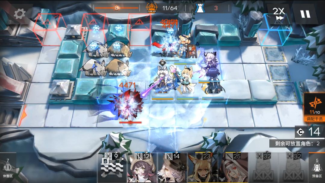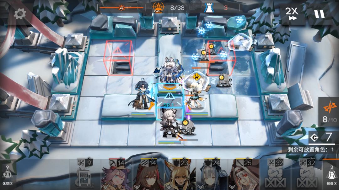 第2关开局先锋,然后换成近卫重装之类的加阻挡,也可以地面放2个干员。叠层的狙击术士朝下,辅助过牌的不要叠层,放旁边当输出度过前面的怪,第一波8个怪,休整期就差不多能放初雪上去,暖机结束后挂机。最后有个怪初雪打不到,需要地面拉普打。
