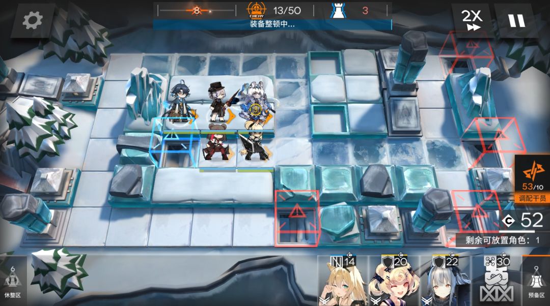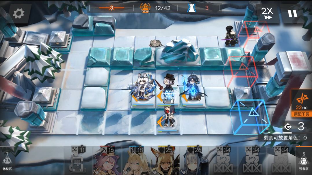 第3关,地面放2-3个干员加阻挡。叠层的狙击术士和辅助过牌的当输出度过前面的怪,第一波15个怪,休整期就差不多能放初雪上去,暖机结束后挂机。