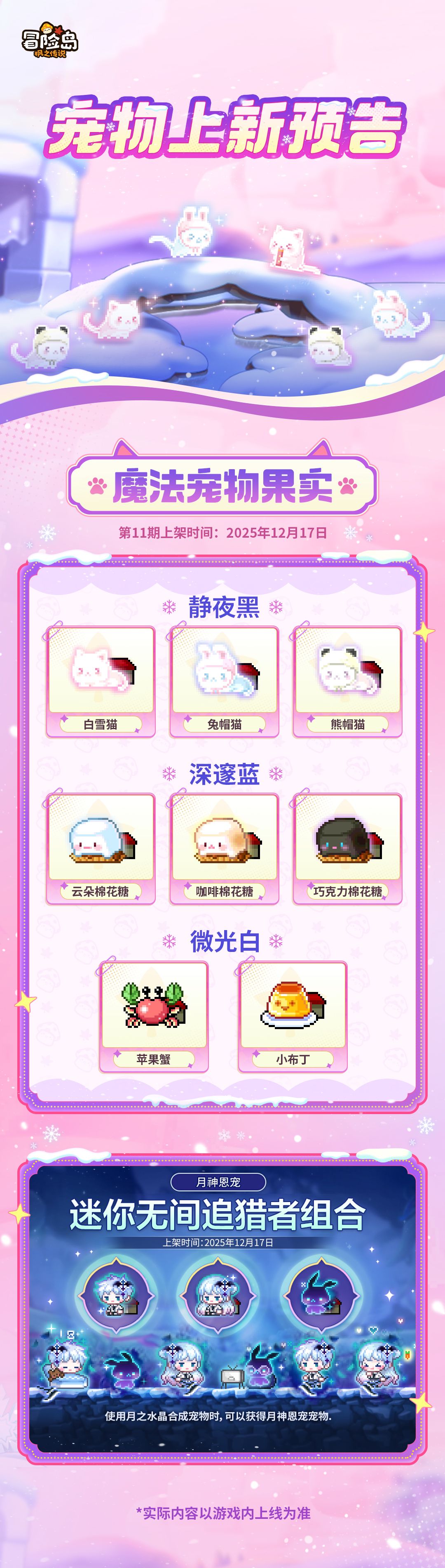 本次上新「魔法宠物果实」第11期,「静夜黑」、「深邃蓝」与「微光白」三大系列宠物上线,为冒险加BUFF!更有月神恩宠 「迷你无间追猎者宠物」强势回归,错过的小伙伴这次可以通通带走!