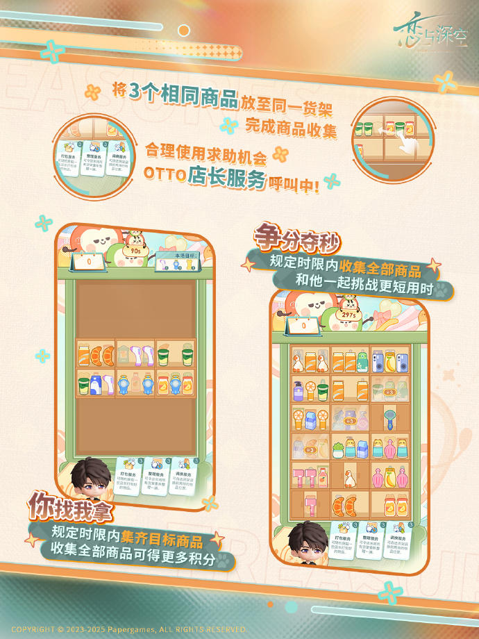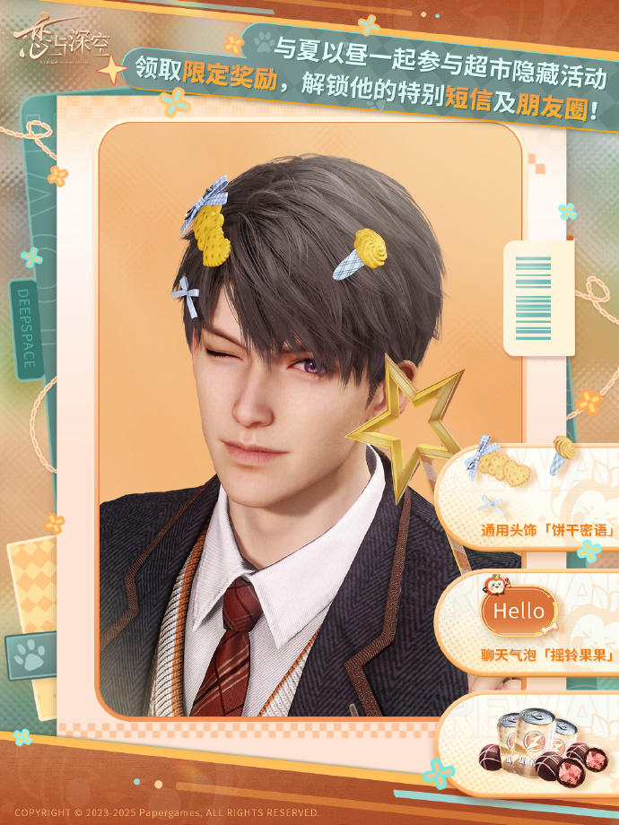 与夏以昼一起整理货架,完成超市挑战,累积积分即可领取通用头饰「饼干密语」、聊天气泡「摇铃果果」、「黑电能量·重磅」及「快乐巧克力」奖励!