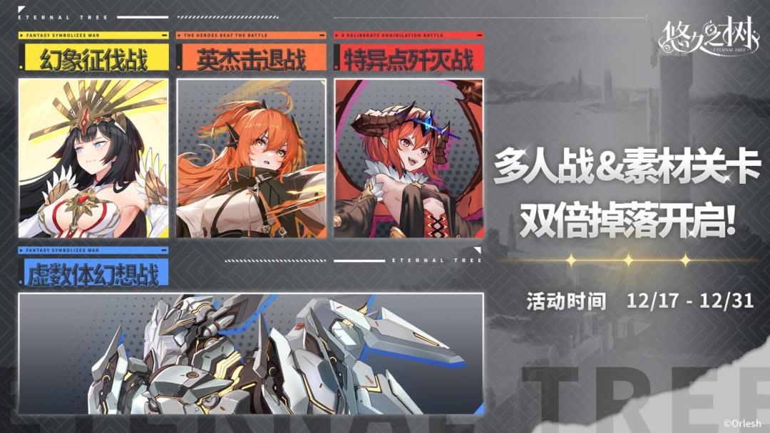 12月17日 维护后 - 12月31日 10:00 ,素材关卡、虚数体幻想战、幻象征伐战、英杰击退战、特异点讨伐战的战利品将全天候双倍掉落!