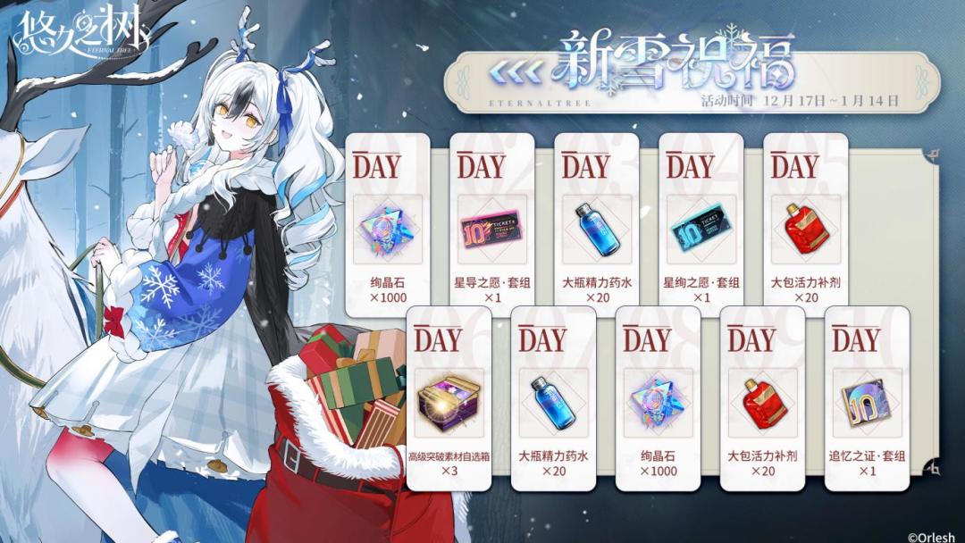 12月17日 维护后 - 1月14日 10:00,探求者大人累计签到达到指定天数,即可在【新雪祝福】活动面板领取星绚之愿·套组、星导之愿·套组、追忆之证·套组、绚晶石等超值好礼!