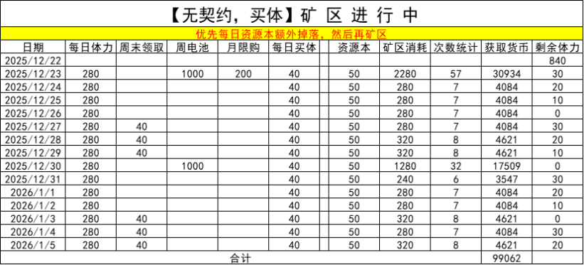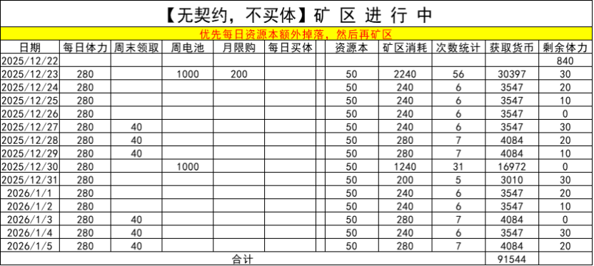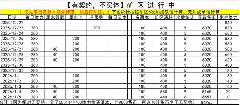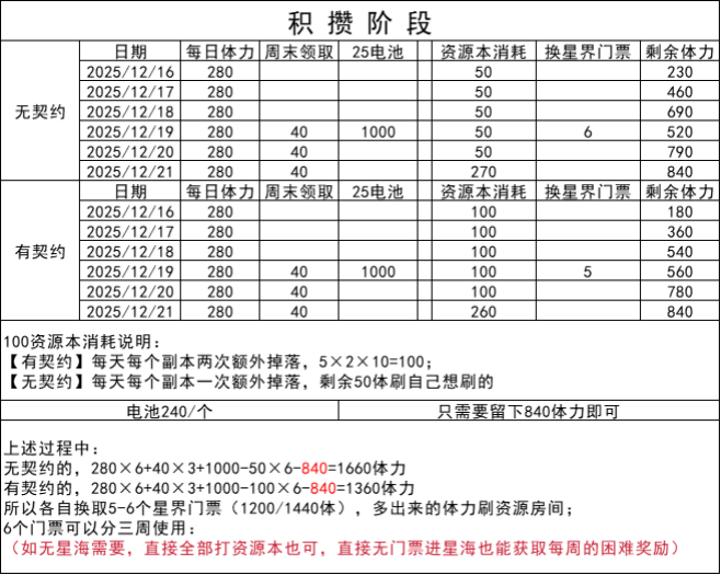2.有契约的玩家需要注意体力分配,保证14天每天都有500体力能用(100体力 资源本+400体力 双倍 矿区每日5次首通);
