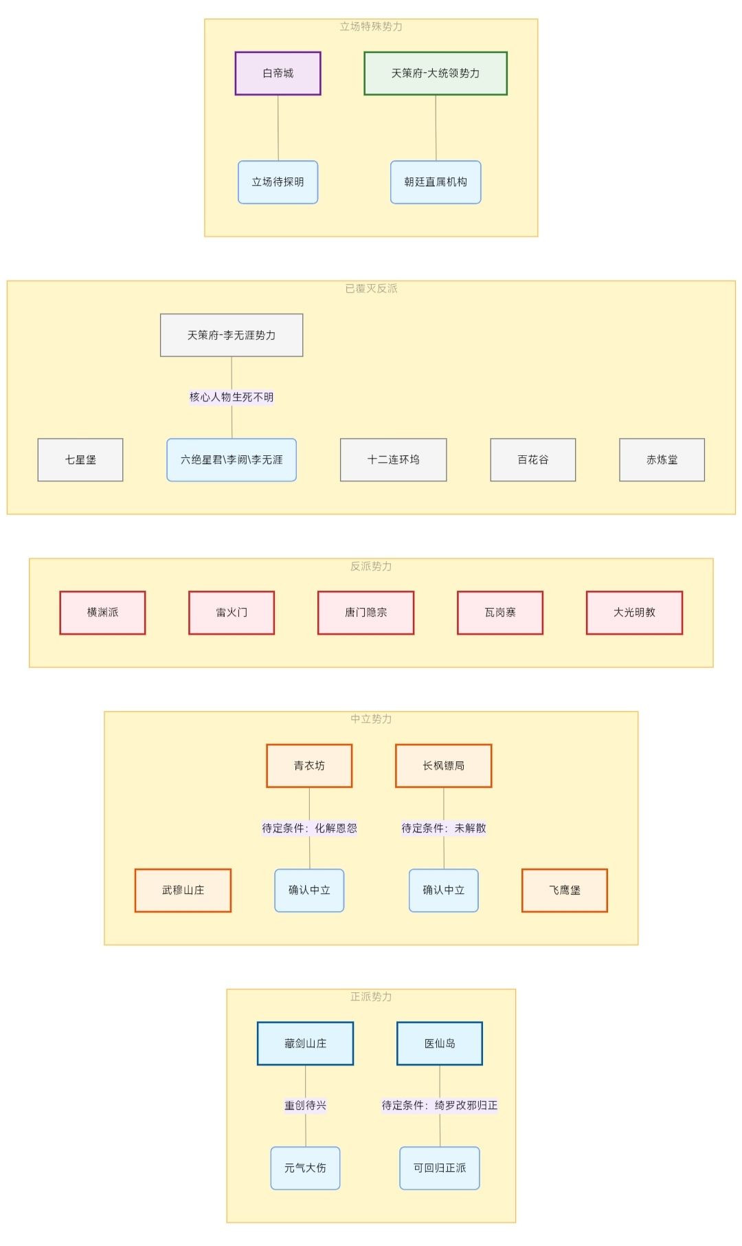 中立:武穆山庄,飞鹰堡,青衣坊化解恩怨后可能中立,长枫镖局若未解散可能中立。