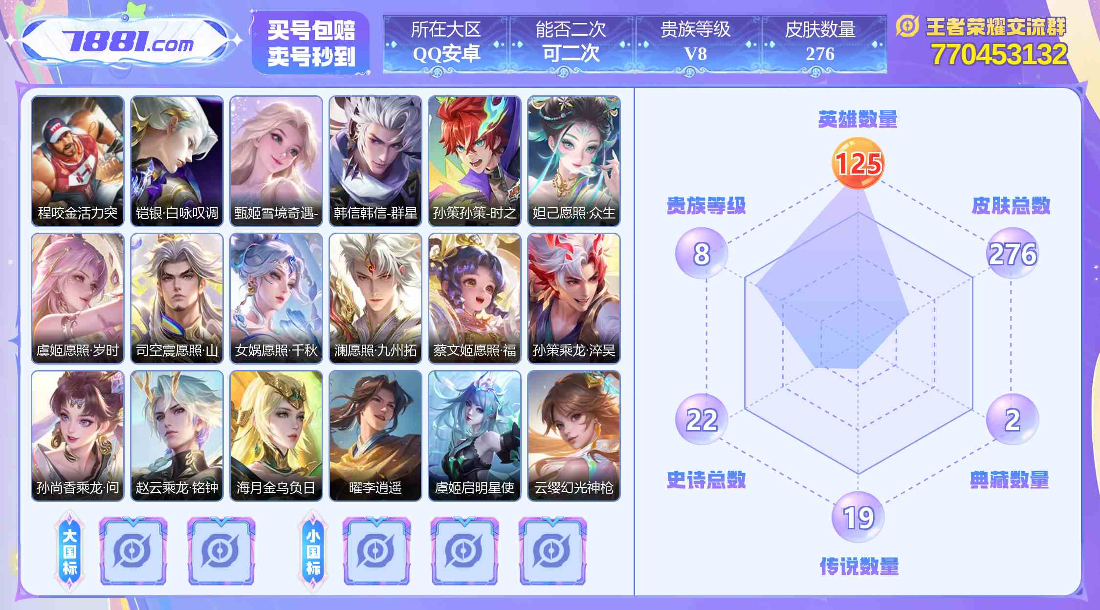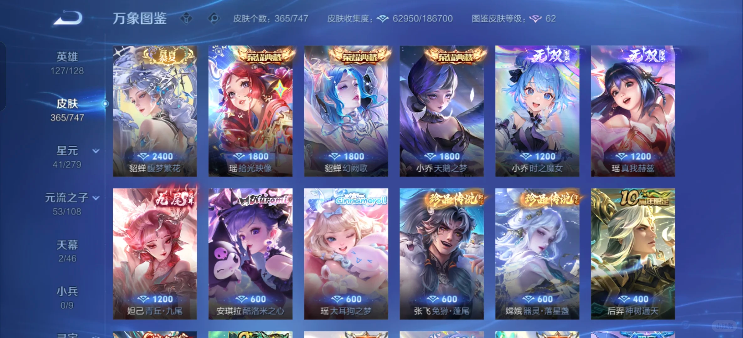 感觉这个还行吧,要二十张左右,皮肤都是热门皮肤,瑶和小乔全皮,还不错吧
