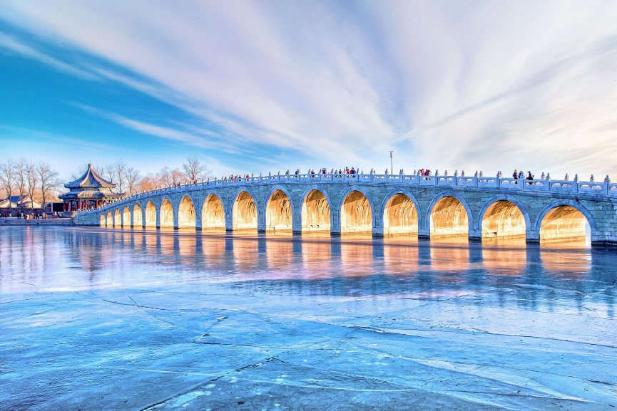这份"水墨画"般的美感,藏着精心设计的建筑美学。十七孔桥的拱形桥洞,天然形成画框,把远处的南湖岛框成画中景;长廊的红色廊柱与白色雪檐,在镜头里构成强烈的色彩对比;谐趣园的假山叠石被雪覆盖后,线条变得柔和,像极了传统水墨画里的"留白"。