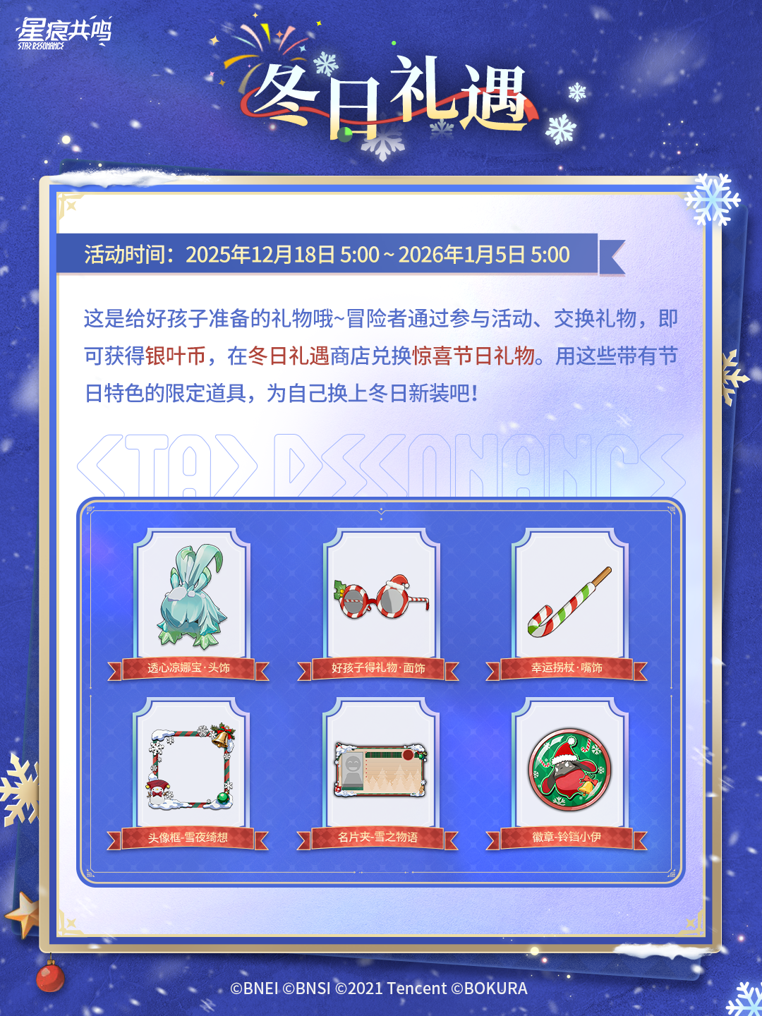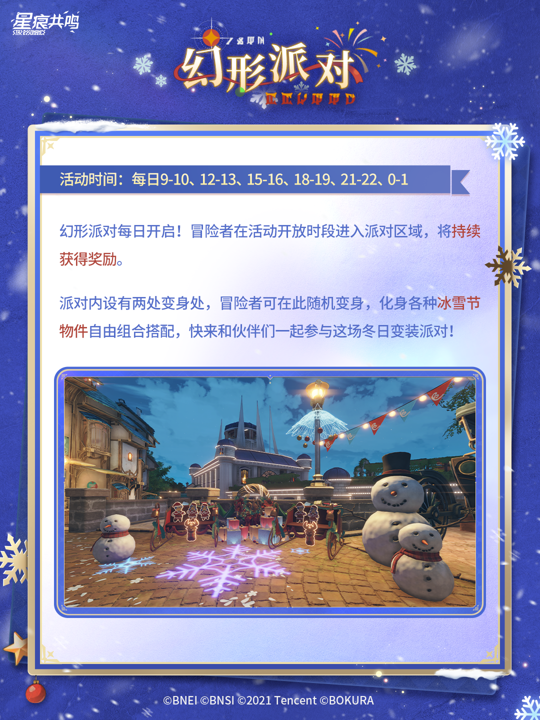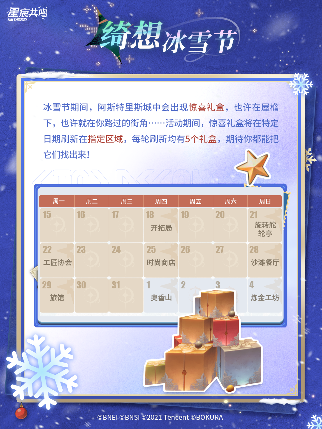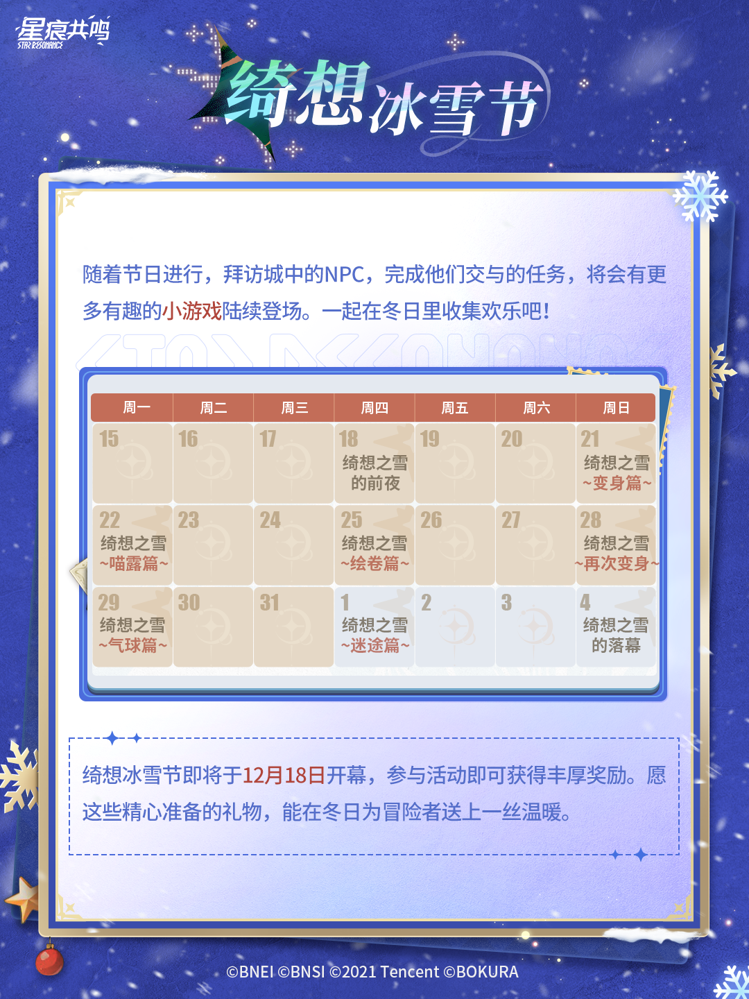 节庆氛围笼罩阿斯特里斯,一年一度的绮想冰雪节即将于12月18日开幕。找礼盒、换礼物、变身雪人、讨伐冰雪娜宝......参与各种有趣的活动,赢得丰厚的冰雪节礼物吧!