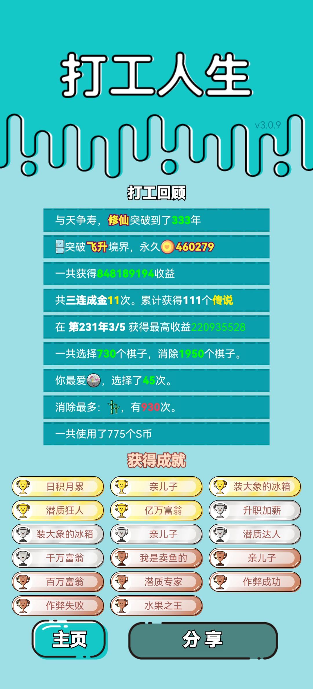 我打工坚持了333年。共获得8274892收益。累计获得111个传说棋子。共选择730个棋子,消除1950个棋子。我最爱undefined,选择了45次。获得了17个成就!