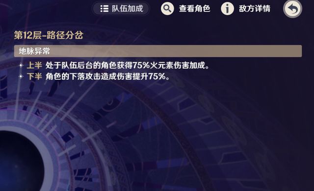 这期深渊的难点,还是在12层,先看地脉异常buff,上路给后台角色75%火伤,杜林、火神都能吃到,下路给的是下落攻击造成的伤害75%,咱们都知道是推瓦蕾莎给的buff。