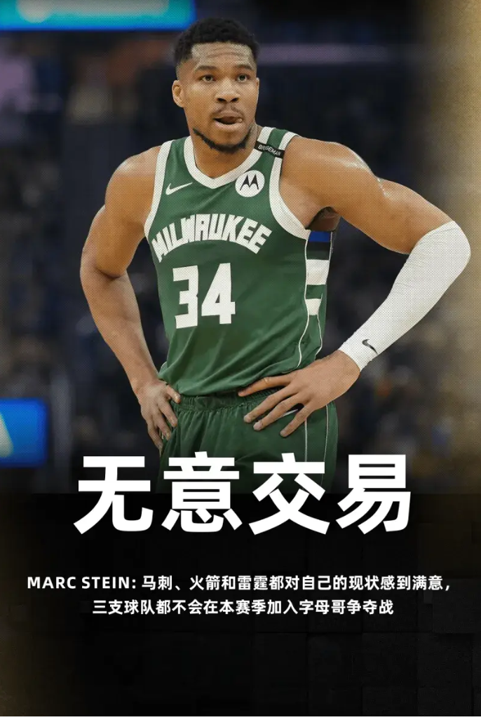 Stein:火箭马刺雷霆满意现状,将不会加入字母哥争夺战近日,交易追踪者们越来越相信,即便是雄鹿最终决定本赛季交易走扬尼斯-阿德托昆博,马刺、火箭和雷霆,他们三支球队都不打算追逐字母哥。