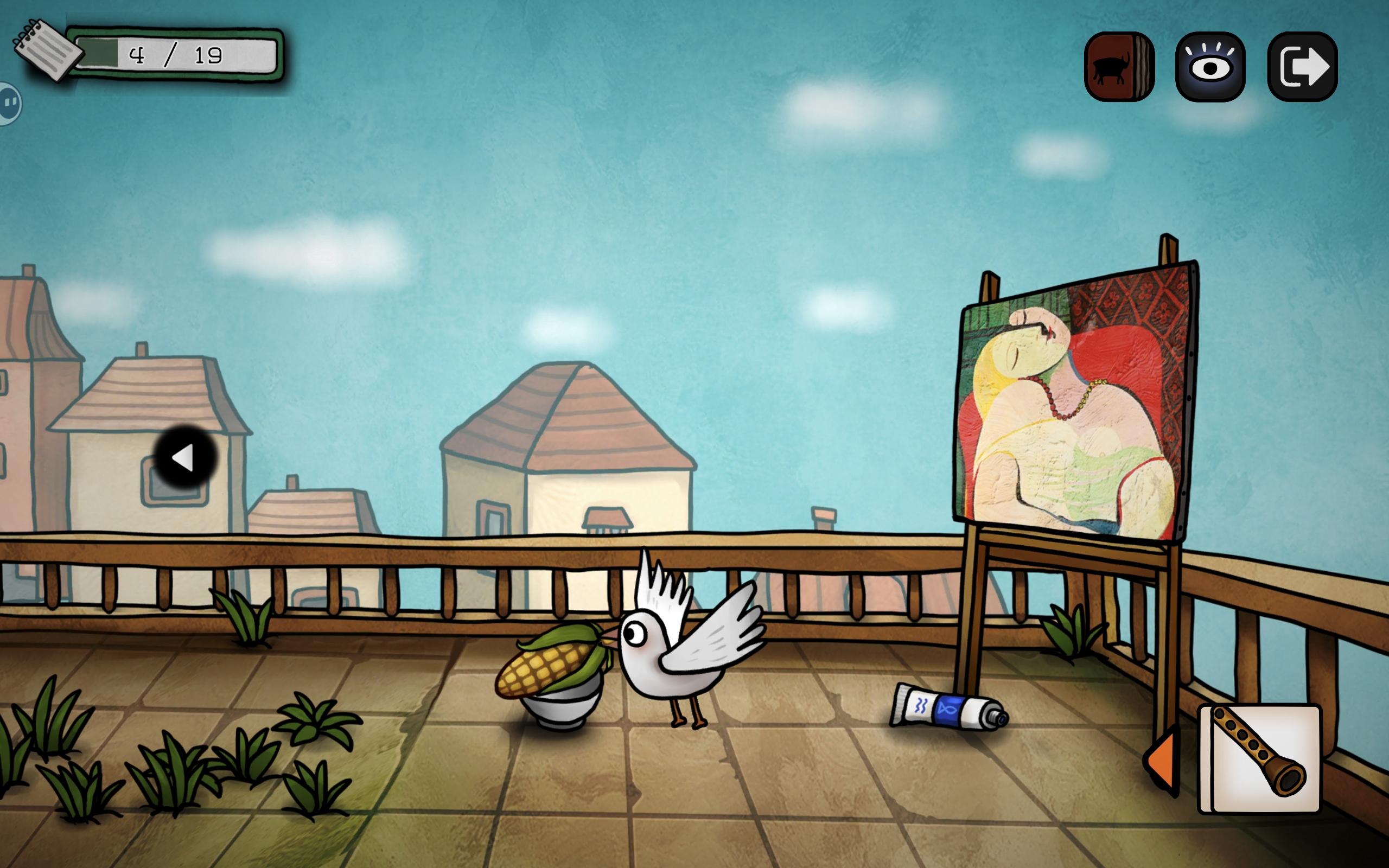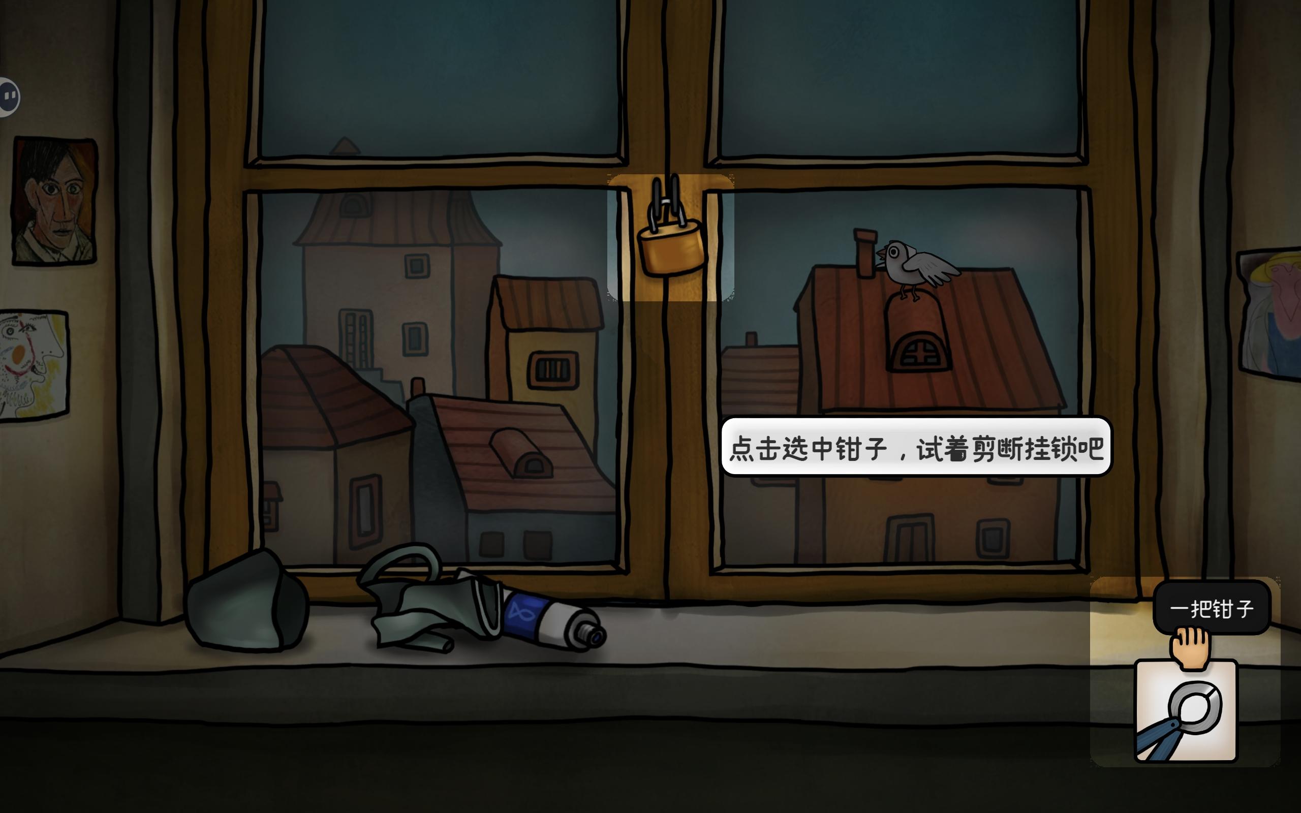 小鸟抓走蓝颜料,进入屋顶,捡起画笔和杀虫剂,小鸟还抓着蓝颜料,在之后触发
