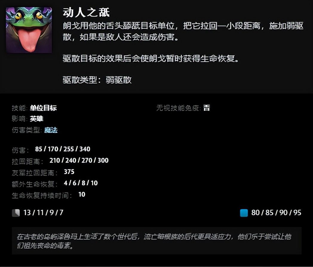 【新英雄云游乐手朗戈登场】新英雄朗戈是力量型英雄,定位是近战、耐久、控制、辅助,也期待着社区玩家能更多的开发新英雄的玩法。一技能为“动人之舐”,用舌头舔舐目标单位并拉回一段距离,施加弱驱散,如果是敌人还会造成伤害。