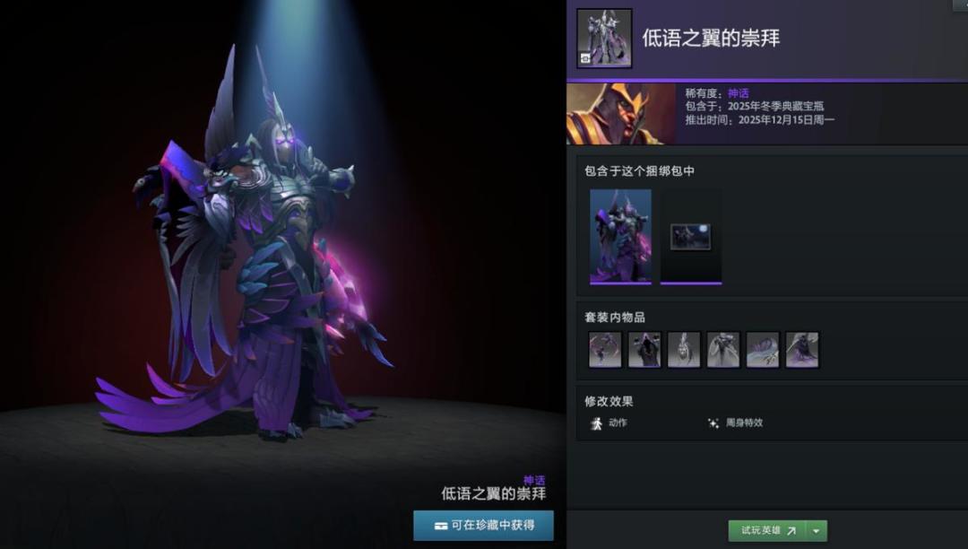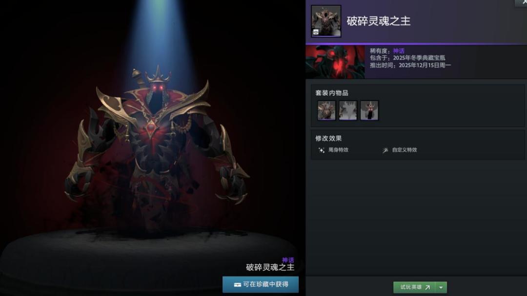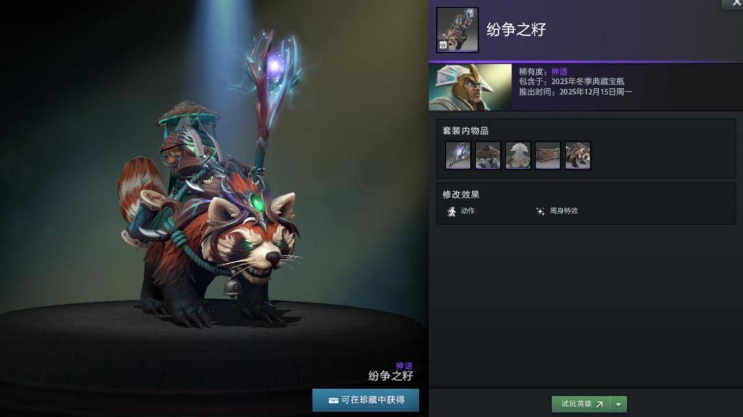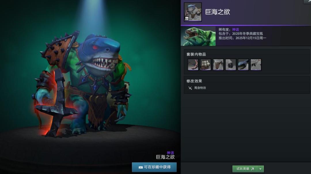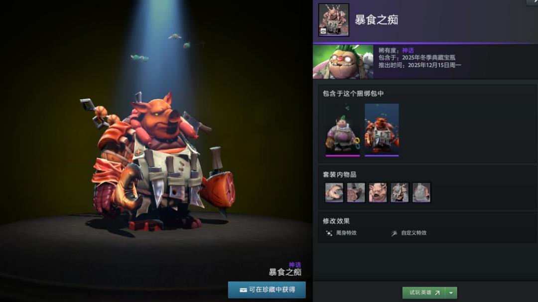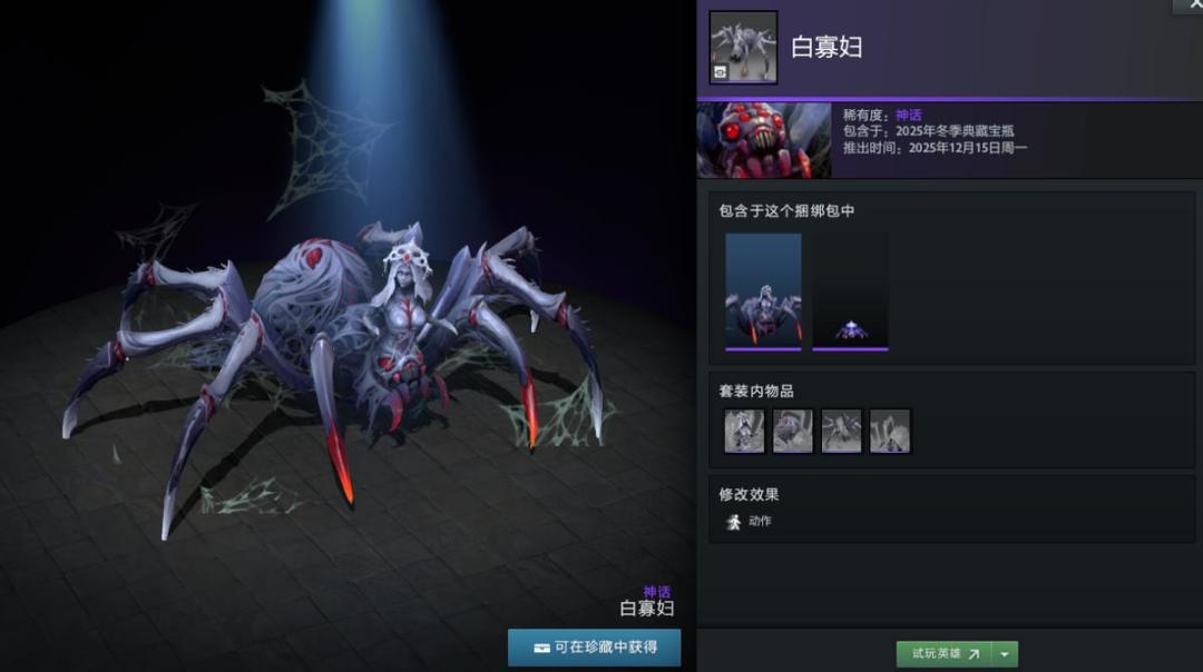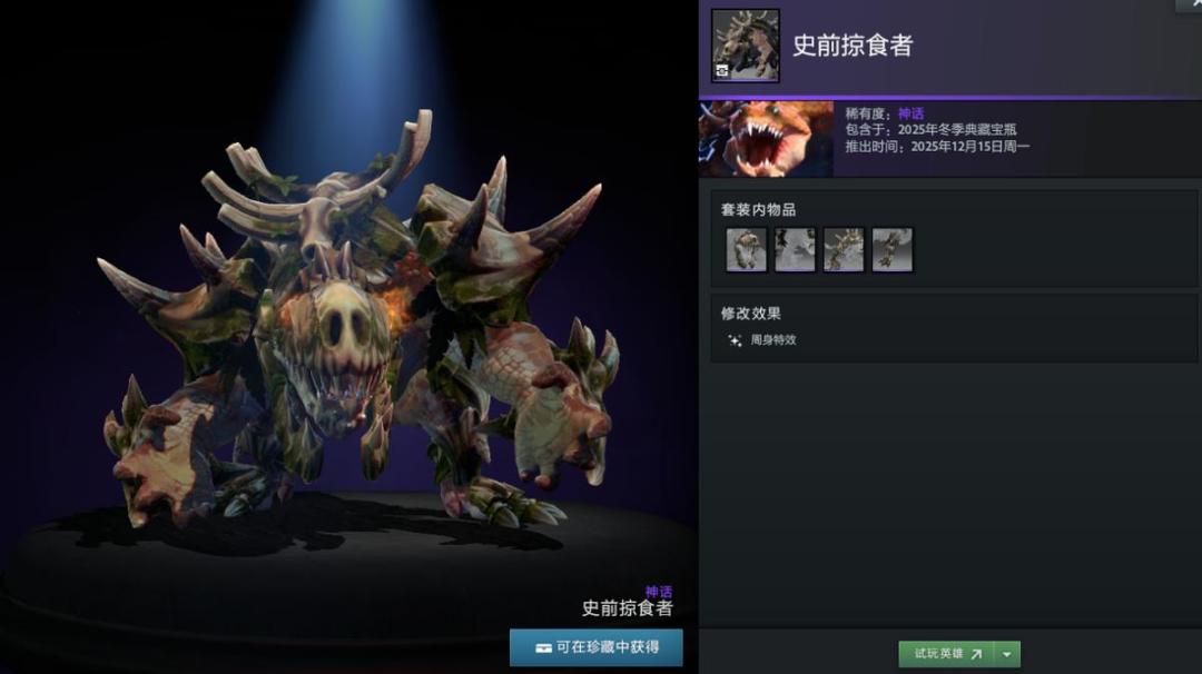 【冬季典藏宝瓶开启】本次更新还带来了2025年冬季典藏宝瓶,内含16套英雄套装,12套普通,4套珍稀。如帕吉身心套装“暴食之痴”,解开套装未拥有帕吉身心玩具屠夫将额外获得;兽的“史前掠夺者”套装身披兽骨;潮汐猎人“巨海之欲”套装戴鲨鱼头;陈的“纷争之籽”套装以小熊猫为坐骑;半人马战行者“灵巧伪装”套装化身小驴;变体精灵“狂乱流体”套装有鲨鱼头;山岭巨人“城堡”套装随大招等级提升外观变化。此外还有影魔、育母蜘蛛等多种英雄套装。影魔和齐天大圣至宝拆分基部,可自由搭配饰品。