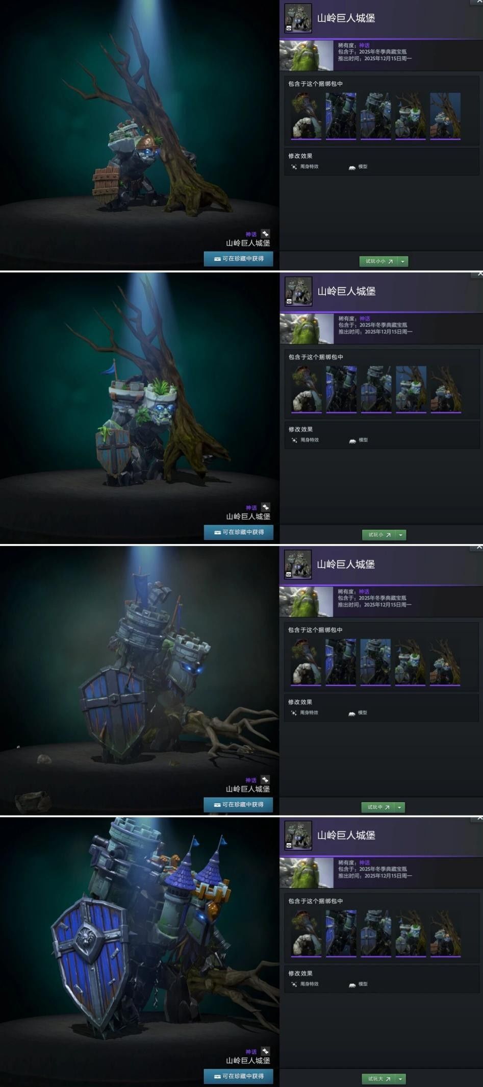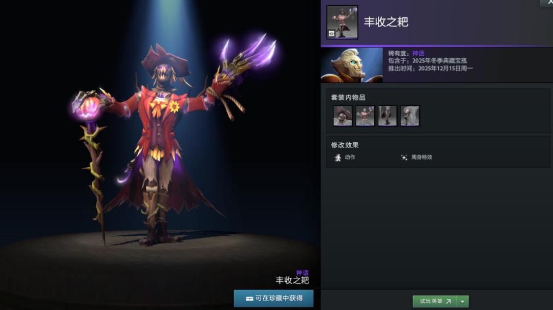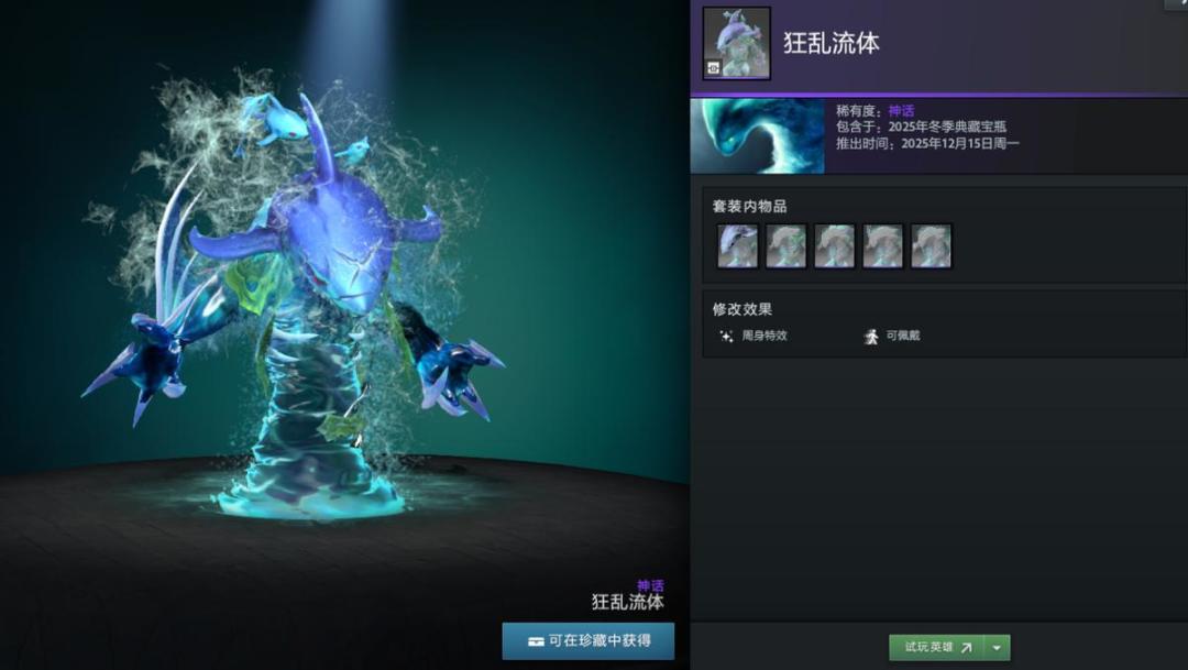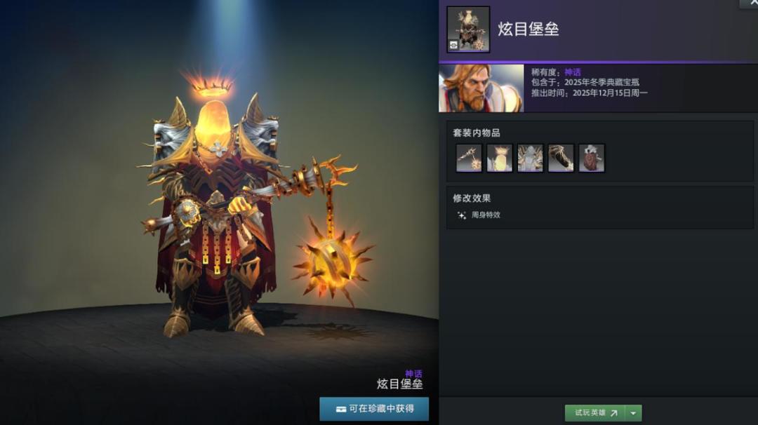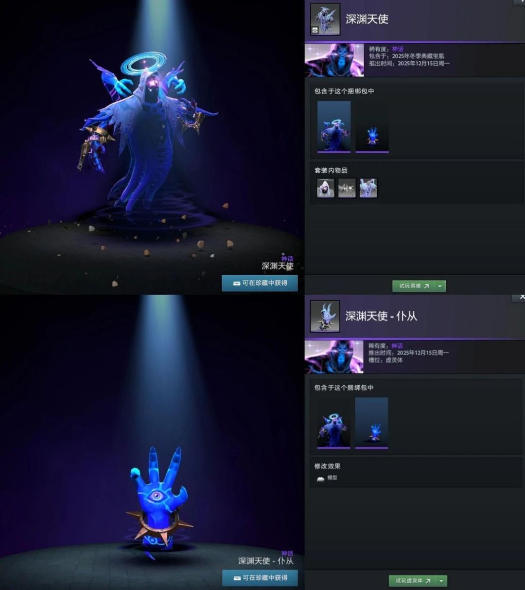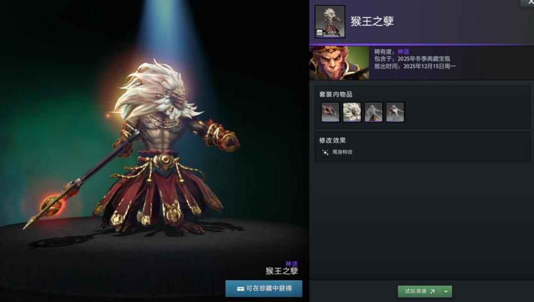 【冬季典藏宝瓶开启】本次更新还带来了2025年冬季典藏宝瓶,内含16套英雄套装,12套普通,4套珍稀。如帕吉身心套装“暴食之痴”,解开套装未拥有帕吉身心玩具屠夫将额外获得;兽的“史前掠夺者”套装身披兽骨;潮汐猎人“巨海之欲”套装戴鲨鱼头;陈的“纷争之籽”套装以小熊猫为坐骑;半人马战行者“灵巧伪装”套装化身小驴;变体精灵“狂乱流体”套装有鲨鱼头;山岭巨人“城堡”套装随大招等级提升外观变化。此外还有影魔、育母蜘蛛等多种英雄套装。影魔和齐天大圣至宝拆分基部,可自由搭配饰品。