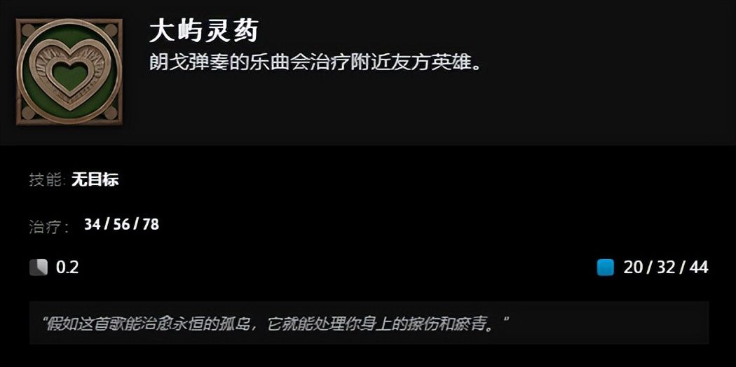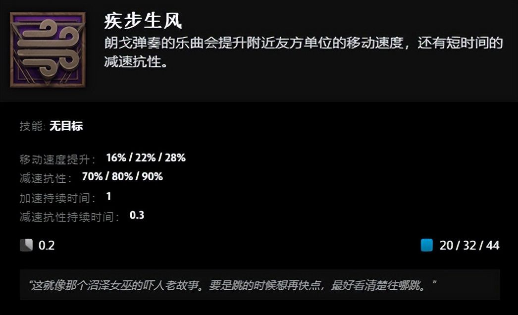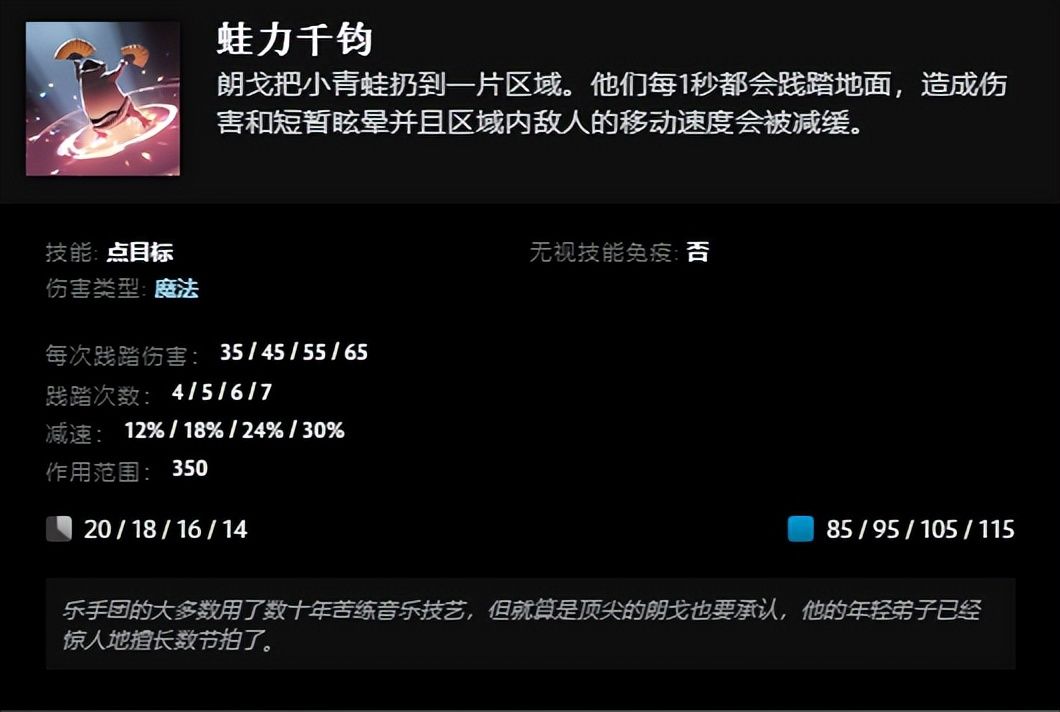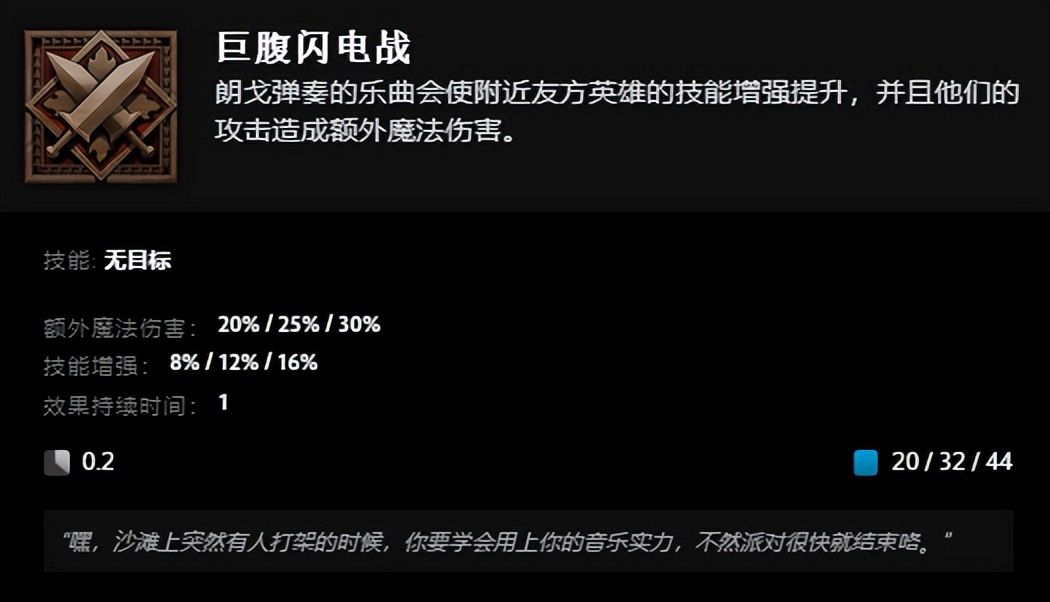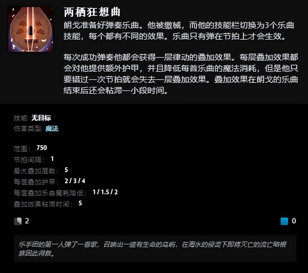 终极技能“两栖狂想曲”,朗戈准备弹奏乐曲,被缴械且技能栏切换为3个乐曲技能,成功弹奏获得得律动叠加效果,增加护甲、降低魔法消耗,错过节拍则失去一层。乐曲一“巨腹闪电战”能增强友方技能,使友方攻击造成额外魔法伤害;乐曲二“疾步生风”提升友方移速,增加减速抗性;乐曲三“大屿灵药”治疗友方英雄。