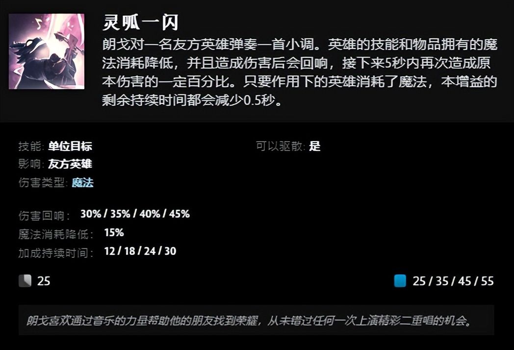 三技能“灵呱一闪”,为友方英雄弹奏小调,降低其技能和物品的魔法消耗,造成伤害会回响,接下来5秒内再次造成原本伤害的一定百分比。如果被增益的右方消耗魔法,则会减少增益剩余时间。