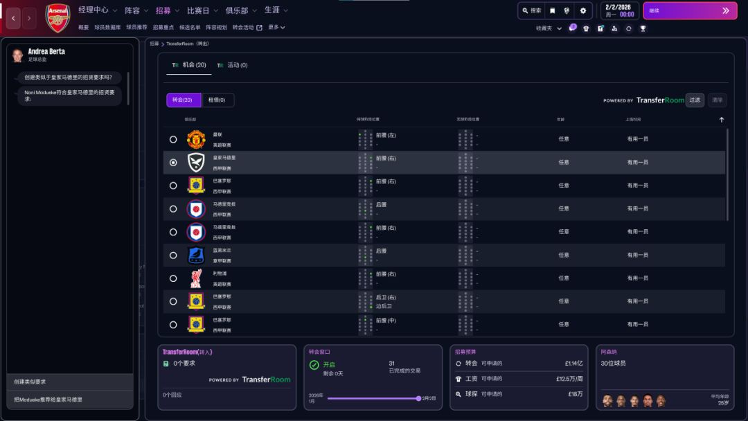 而这一点还得提一下,虽然最新的FM26比较大的变革(尤其是UI)让不少老玩家不满,但比赛画面的精进,以及与时俱进加入了“Transfer Room”这种内容,体验确实还是有很大的加分。