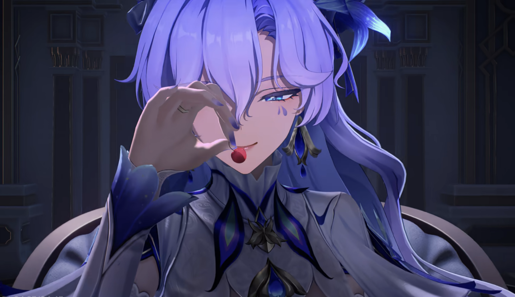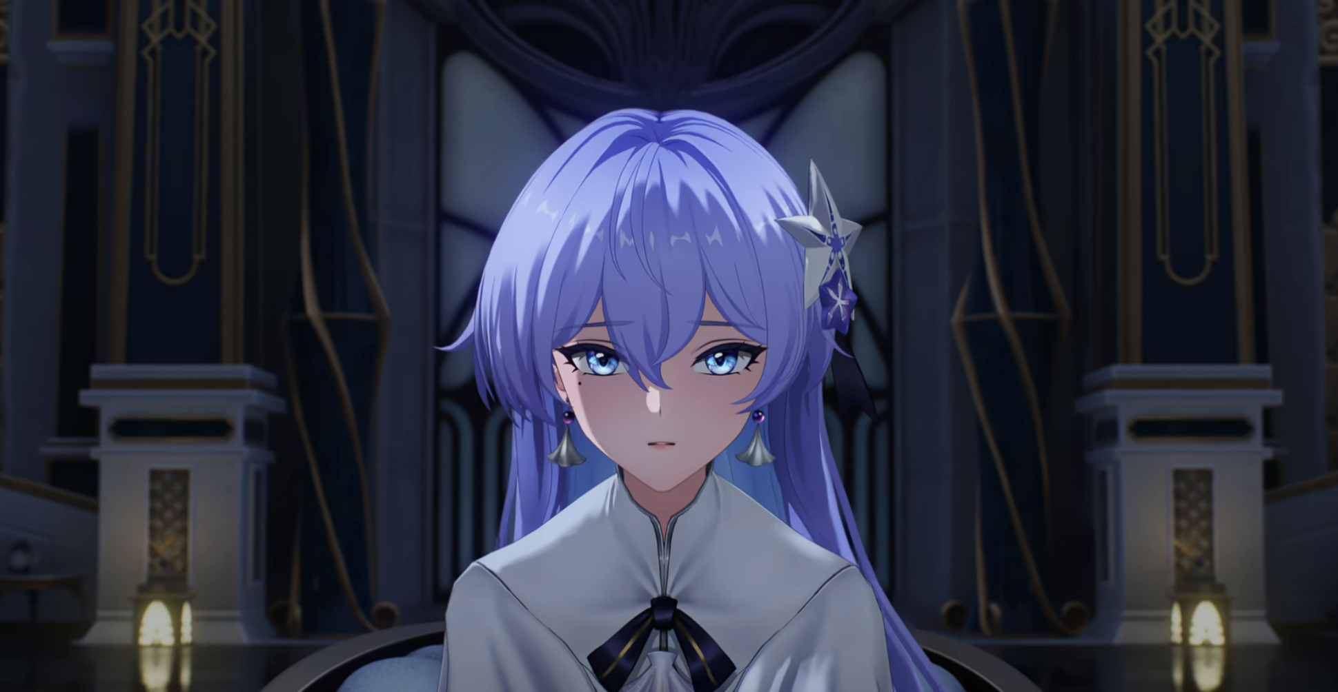 她抬起那双蓝紫色的眼眸,眼底原本萦绕的朦胧雾气早已散去,如平静海面般的眼眸中泛起细碎的涟漪。