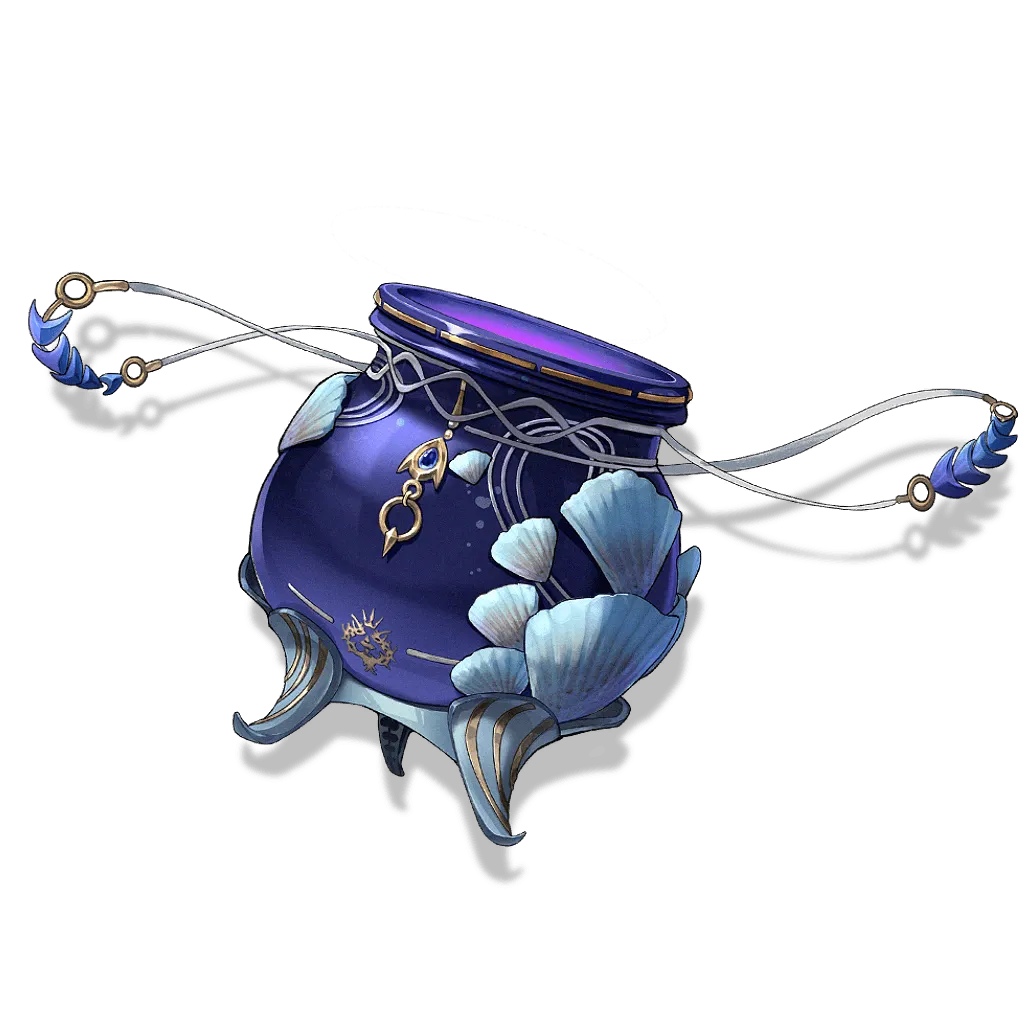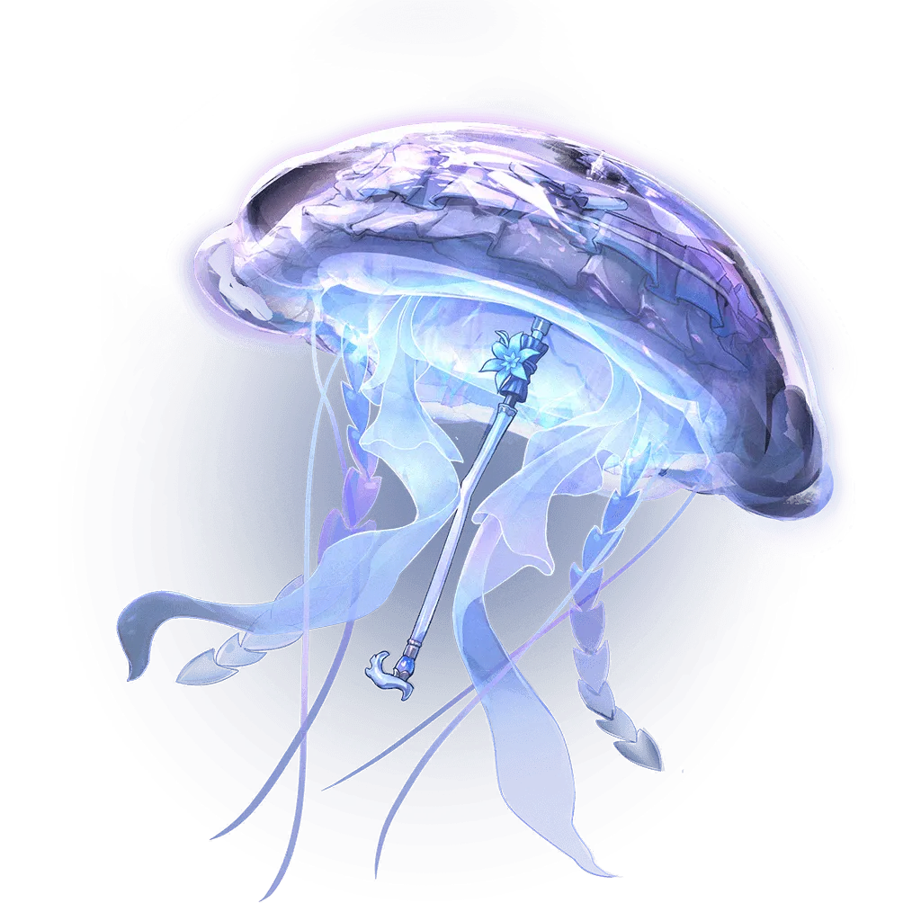 她随身只携带两样东西。一样是珊瑚骨制作的洋伞,伞盖形状圆润,宛如一只软嘟嘟的水母,长长的“触手”悠闲地随风飘荡;握柄处镶嵌着一颗蓝宝石,象征着翡萨烈家主的威严与权力。坎特蕾拉不推崇暴力,但若是迫不得已要动手……她只需转动洋伞。霎时,伞面流光溢彩,美轮美奂的水母群从伞下涌出,翩飞成一片幻影之海。让敌人自愿坠入这美丽却致命的幻海——这便是现任翡萨烈家主坎特蕾拉的立世之道。这柄洋伞,亦如它的主人,看似温柔似水,实则坚不可摧。