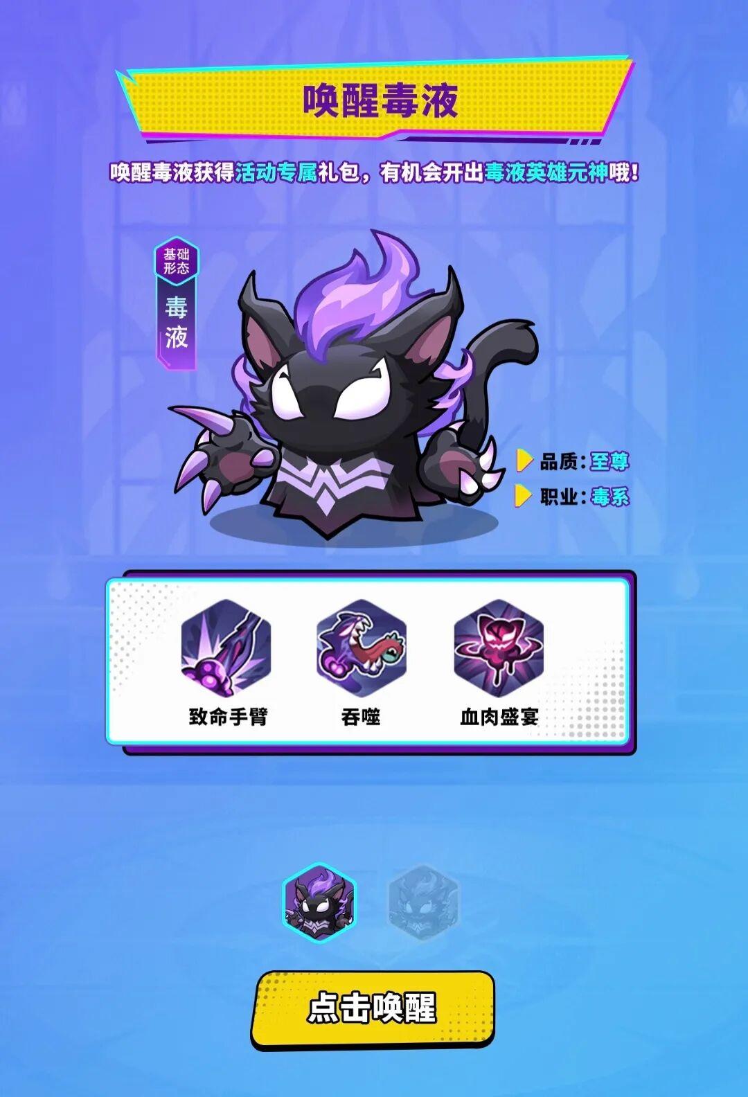 快点击活动页面最下方【点击唤醒】按钮,分享毒液海报,还将获得【专属礼包】,开启后有概率直接获得毒液元神,获得新英雄就趁现在!
