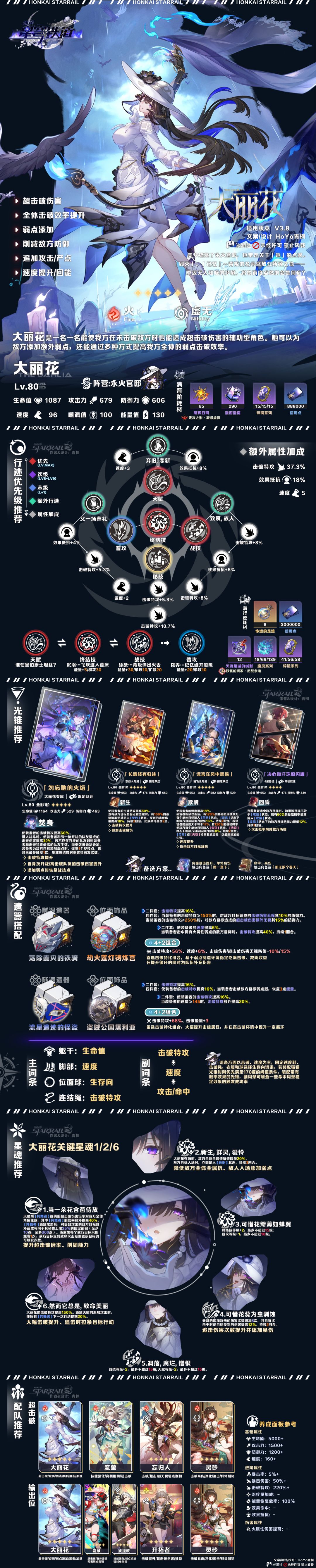 ●依靠流萤+大丽花,灵砂可稳定协助火弱点击破,提供击破易伤覆盖,大丽花行迹受治疗可延长击破增益覆盖,灵砂的主动和追击治疗频率较高,可稳定该部分收益;