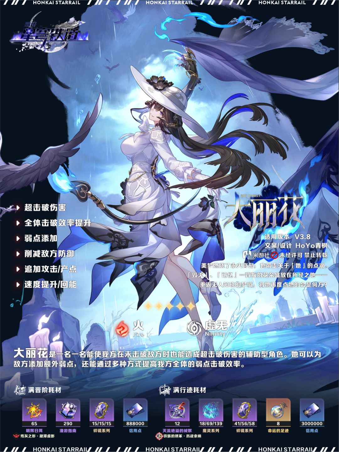 大丽花是一名火属性-虚无命途角色,可指定自身及1名队友成为【共舞者】,双方共同获得高倍率的超击破收益,同时具备独有的"击破前置出伤"机制,改变击破窗口期出伤的底层逻辑,在击破前后期均可造成超击破伤害,同时提升削韧系数,并提供加速、回能等循环加成,使击破角色出伤不再受限,也能更高效的击溃敌方韧性条,所带来的多项数值增益可显著提升击破队的输出上限;