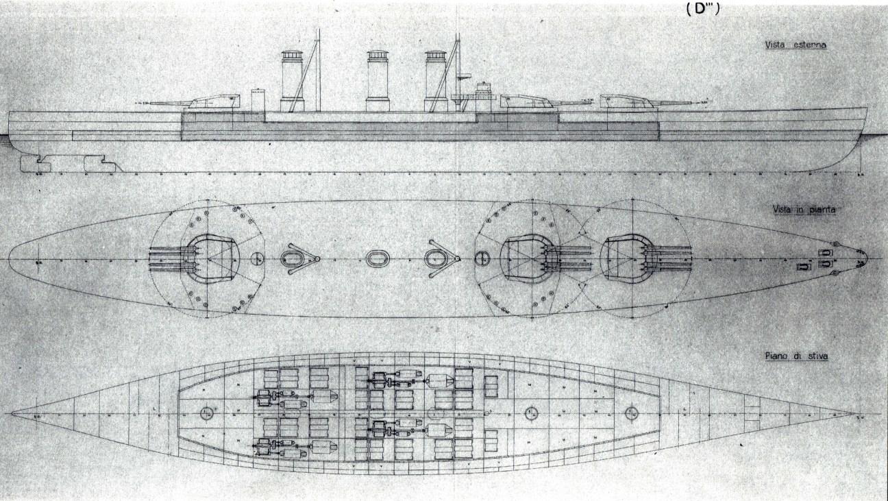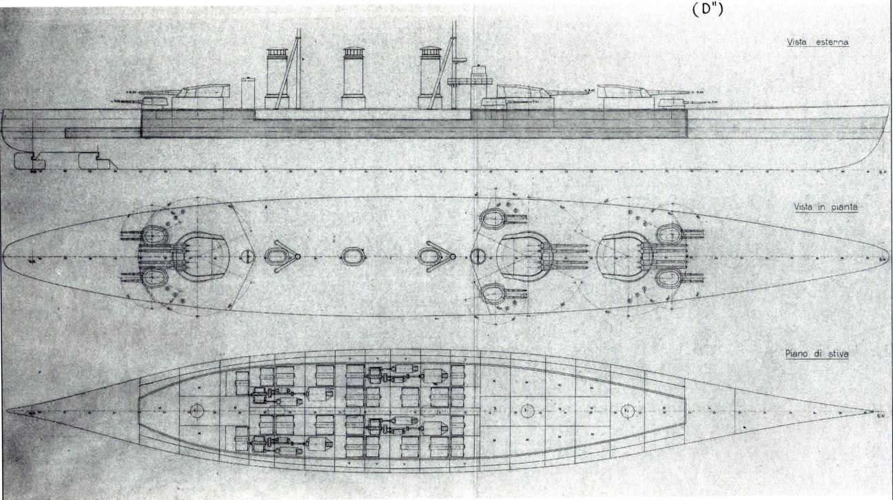 海军工程师费拉蒂少将在拉佩奇亚兵工厂设计了首批高速战列舰-四艘卡拉乔诺级。在意大利海军办公室存放着九个后续设计。分为三组F,D和G系列,都装备了四联装381mm炮塔。
