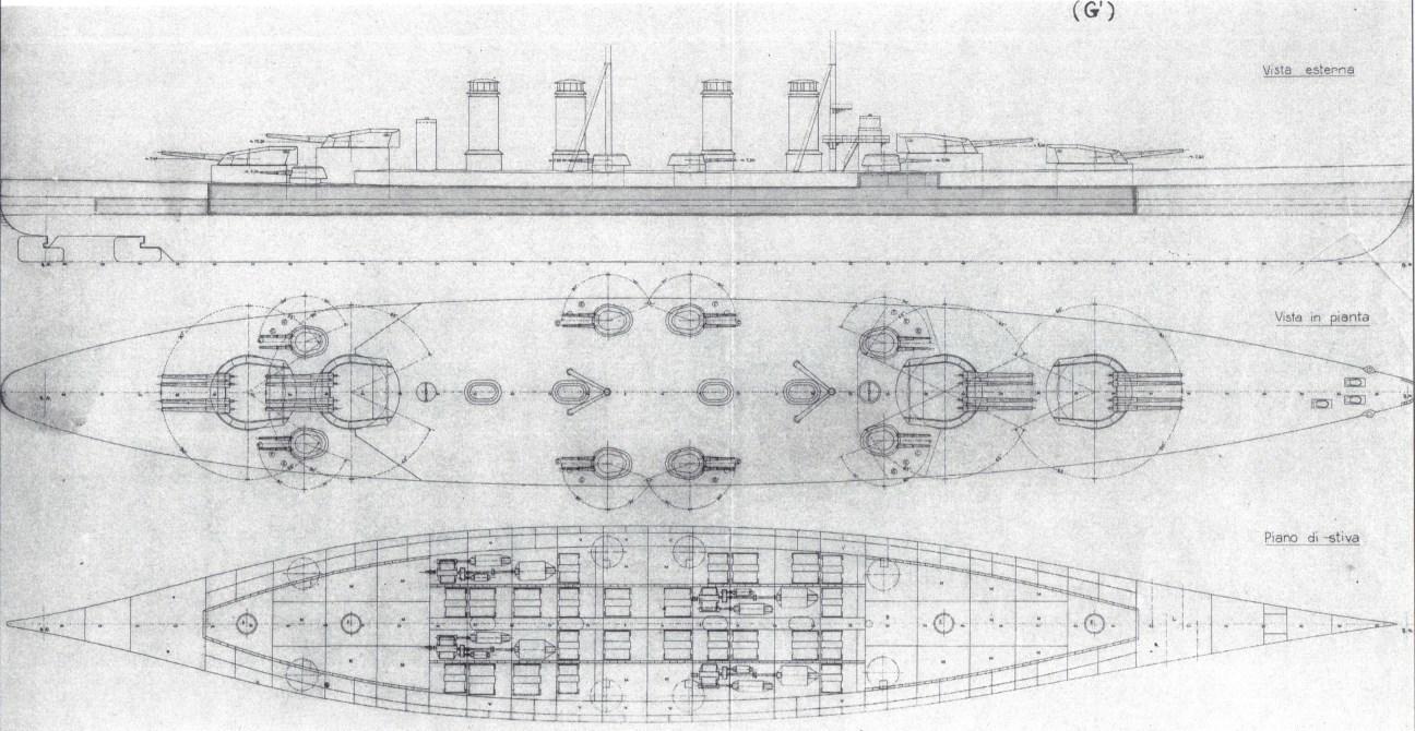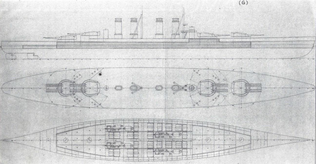 G,(费拉蒂可能喜欢的设计):37200吨,225m。武备四座四联装381mm四十五倍径炮,八座双联装152mm五十倍径炮,二十门单装102mm五十倍径炮。装甲带厚度270mm和170mm,与之前的设计相同,装甲没增加1mm需额外增加310吨。