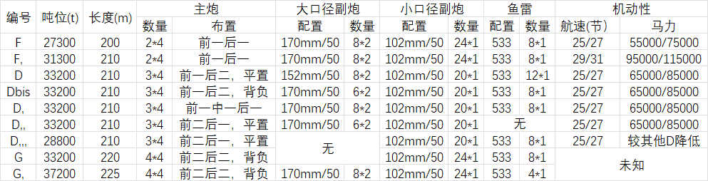 D,,,:与D,,相比副炮配置更轻量,没有170mm或者152mm副炮,28800吨,速度不变马力降低。