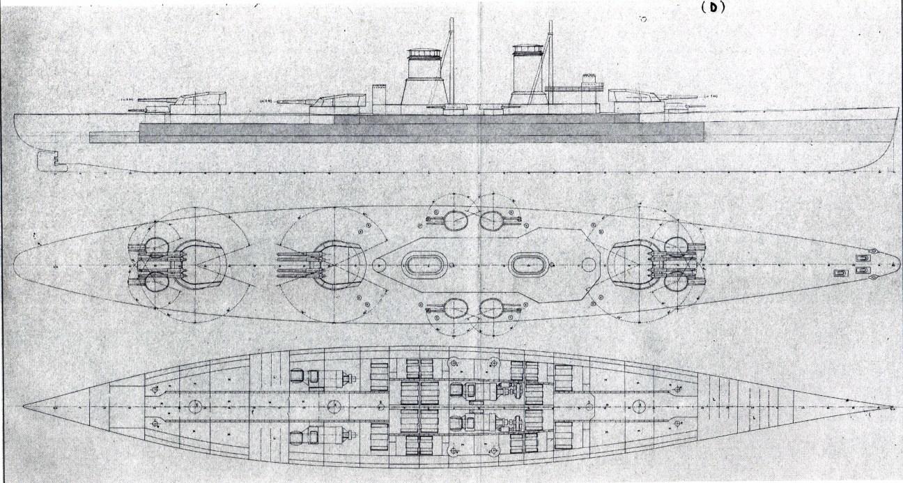 F:27300吨,200m,两座四联装381mm四十倍径炮,八座双联装170mm五十倍径炮,二十四座单装102mm五十倍径炮。八门533mm鱼雷,25/27节对应55000/75000马力,装甲带270mm,长度达船长三分之二,从舰艏延伸至第一舵。(可以看到,该舰采用的是前后纵列的舵机设计)