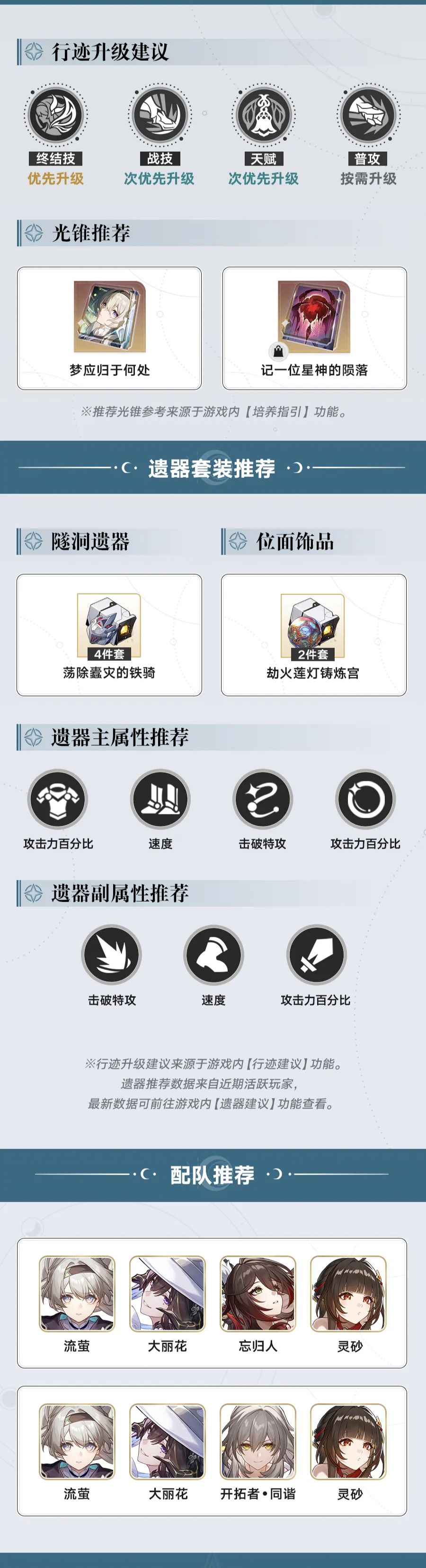同期光锥卡池推出5星「勿忘她的火焰」(虚无)与「梦应归于何处」(毁灭),前者强化持续伤害机制,后者提升生存能力,与UP角色形成闭环搭配。4星光锥「晚安与睡颜」(虚无)时隔一年复刻,其debuff增伤效果仍是虚无体系平民首选。
