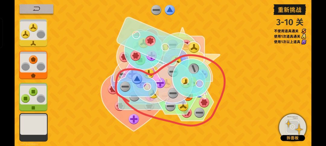 首先是开始阶段的图一 把解题目标放在右侧这块 左下角的蓝色螺丝绝对不要点 在点完两组之后到达图二阶段