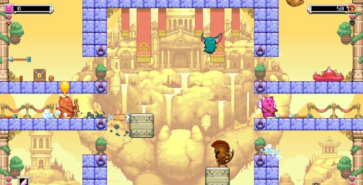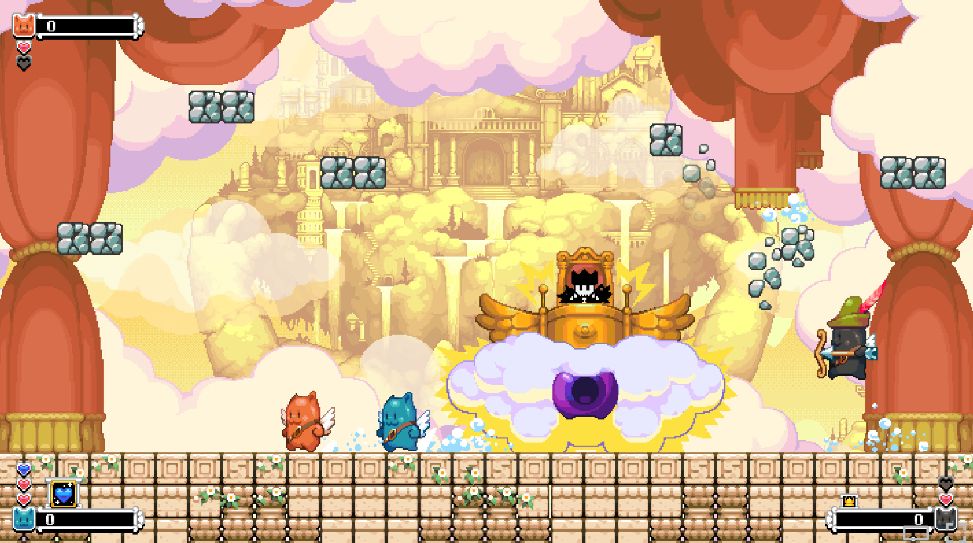 这是一款街机风平台跳跃射击游戏,你将化身天使猫猫,拿起弓箭守护家园。