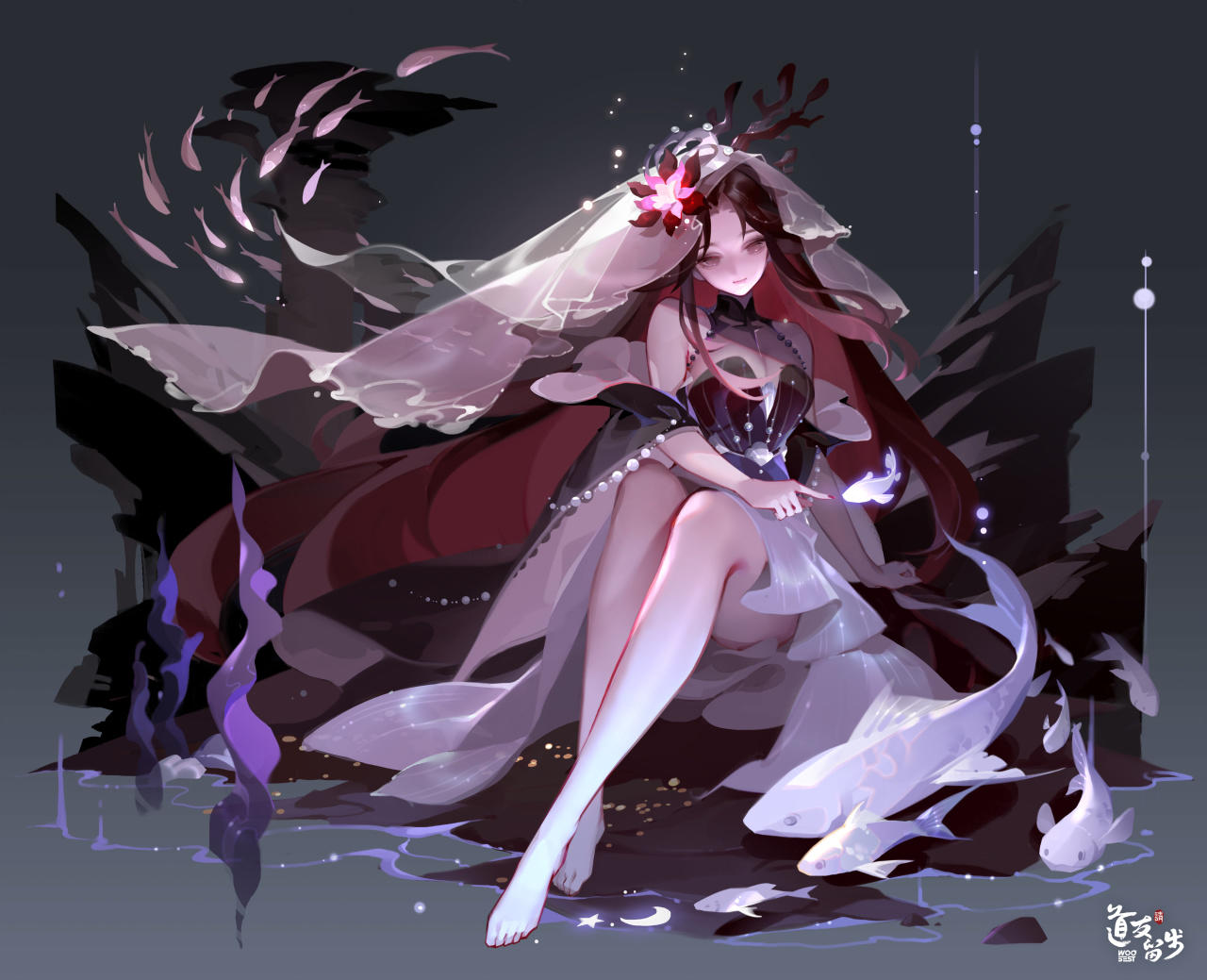 她自寂静深海而来,鱼尾长裙曳过之处,鱼群如星河环绕,让幽暗海底泛起温柔的光。她是海的女儿,亦是光的引渡者。