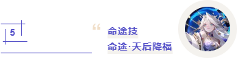 <天后之印> :神焰祝福;本场战斗中,自身每消耗4点绮焰点(仅计算通过主动释放绮焰技、绮焰连携技消耗),提升自身10%气运减伤,最多提升至50%。不可被复制;不可被加减回合;不可被驱散(9级)/抵御(9级)/转移;持续整场战斗。