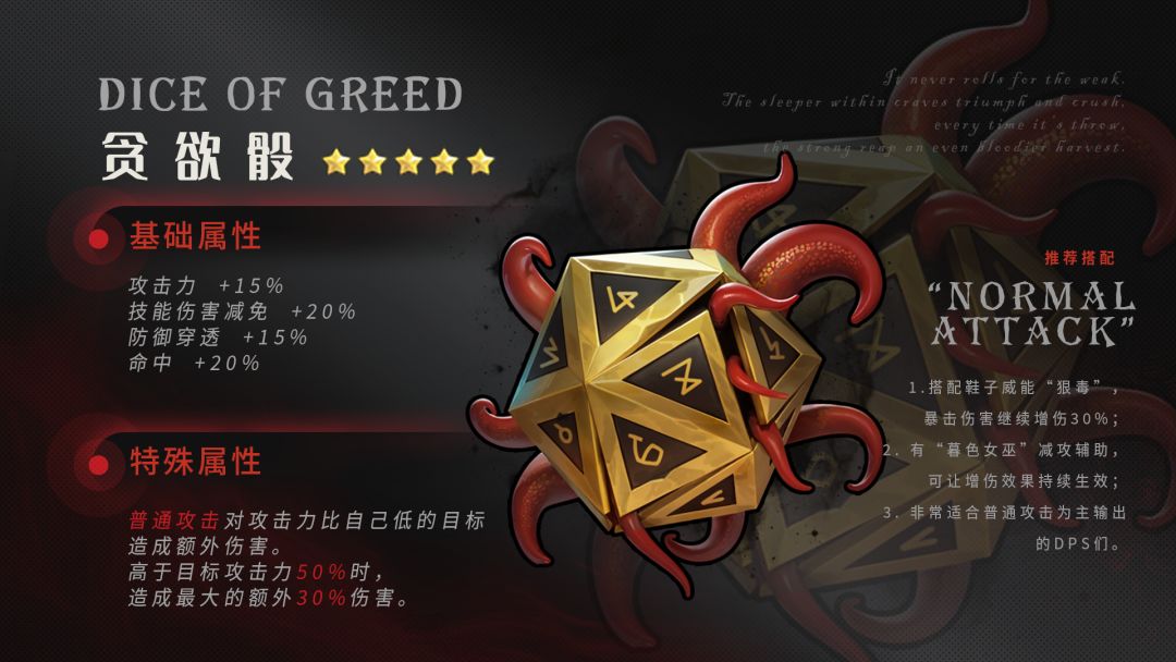 - 「贪欲骰」则是最大可提供30%的普攻增伤,以及给佩戴者提供15%的攻击力加成。