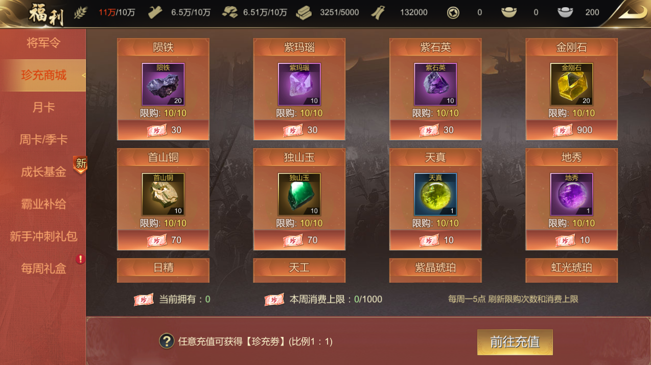 全新福利板块 ——珍充商城即将上线!为回馈各位君上,本商城主打 “少投入高回报” 核心福利,让君上们用更少的花费,换取更多实用游戏道具,助力领地发展、战力飙升!目前商城具体物品仍在规划中,最终上架内容与兑换规则,均以游戏内为准,敬请期待!